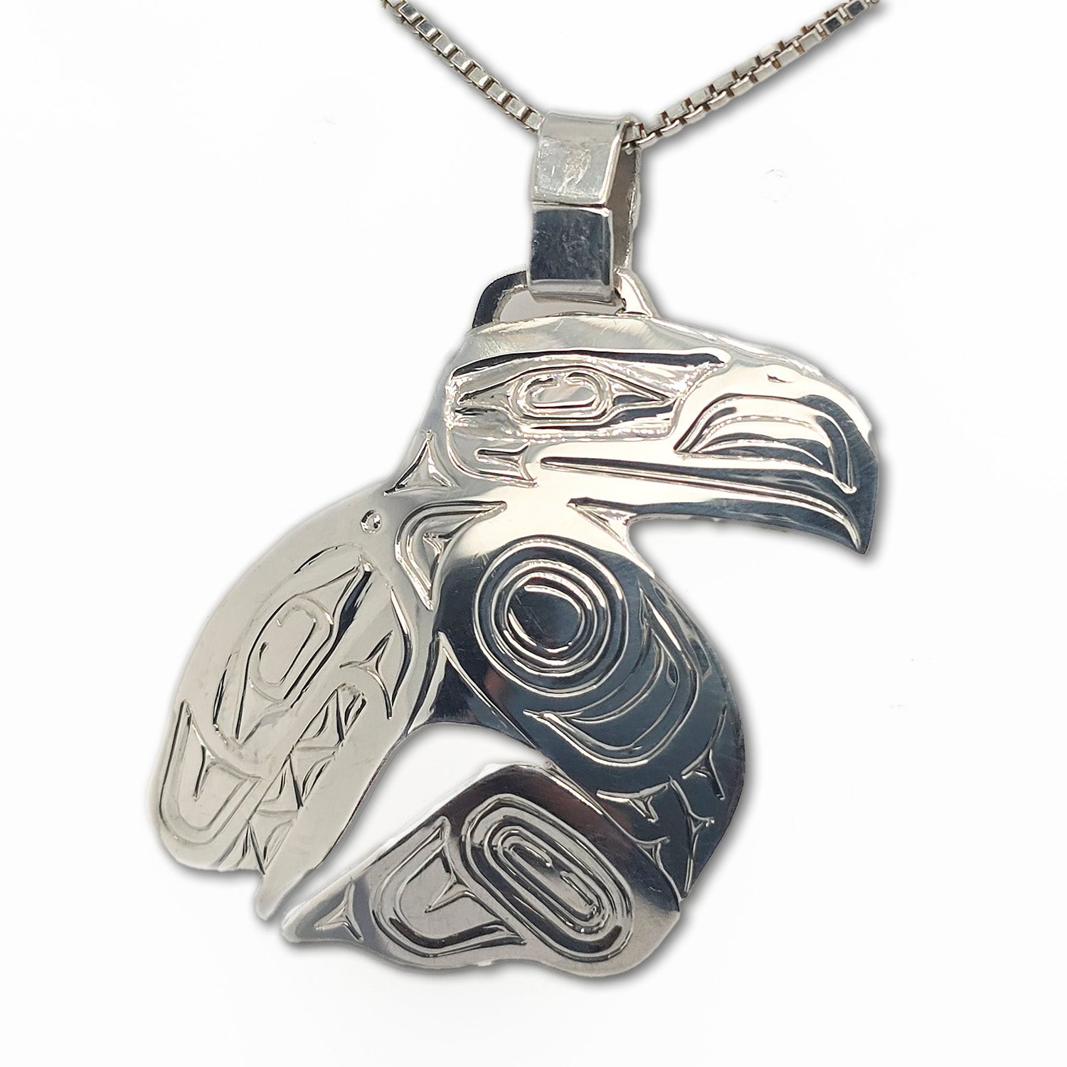 This Raven & Orca Pendant is hand carved in sterling silver by Garner Moody from the Haida Nation.