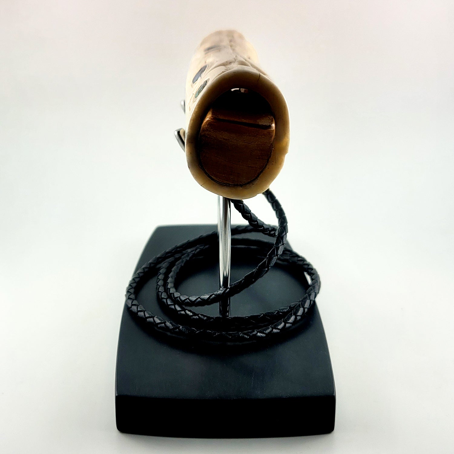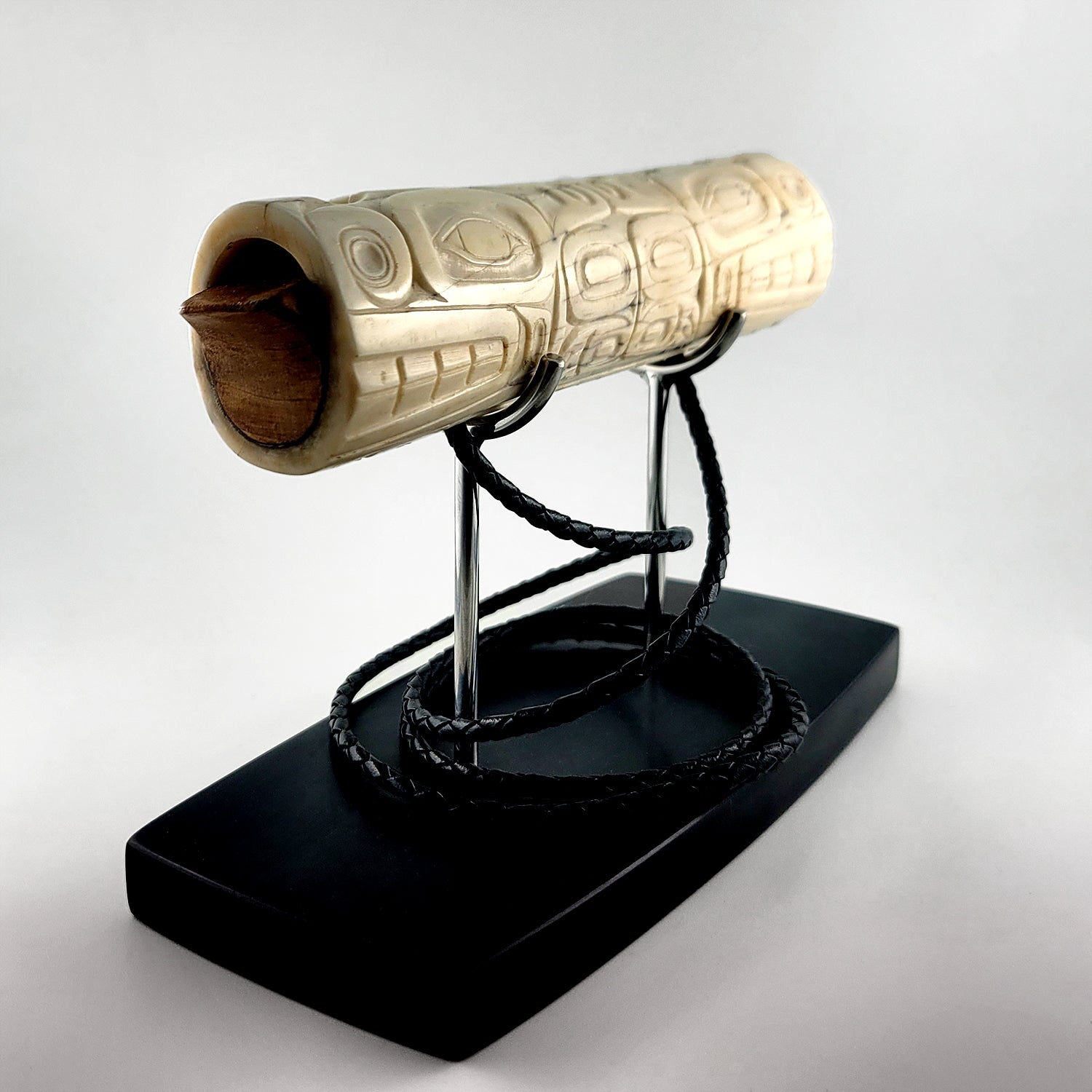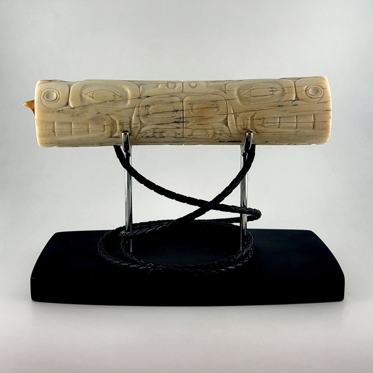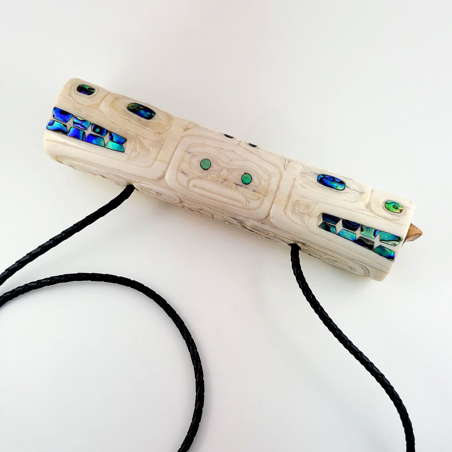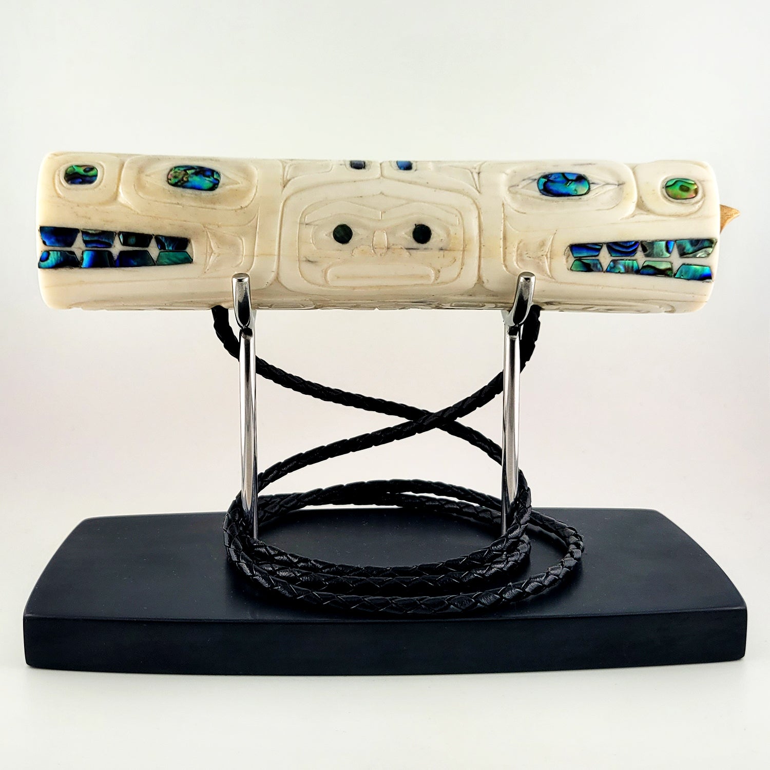 This Soul Catcher Whistle is hand-carved in ivory by Derek White from the Haida Nation. The whistle features abalone inlays and it is signed on the bottom. It comes with a stand and a piece of waxed black rope to hang the whistle around the neck. It was acquired from a collection in good condition.