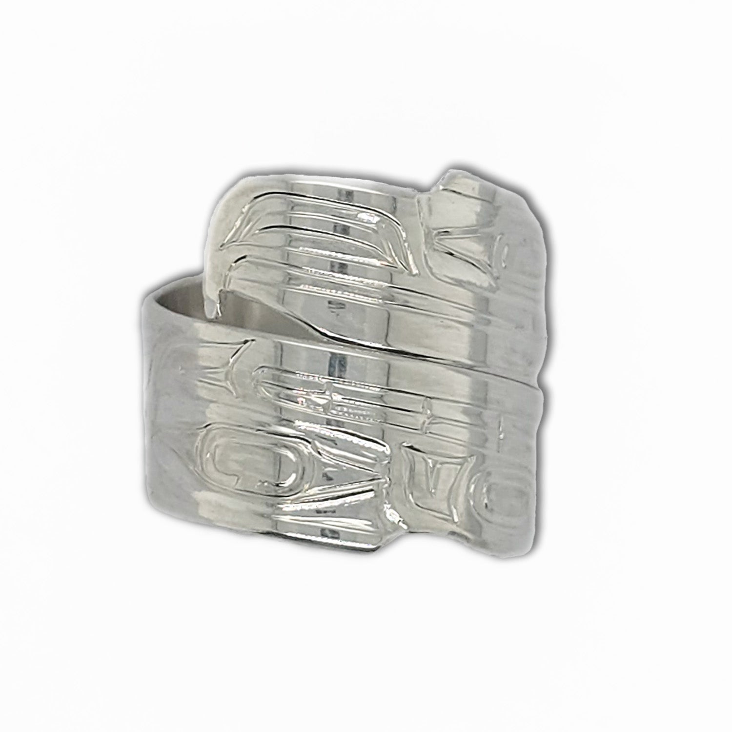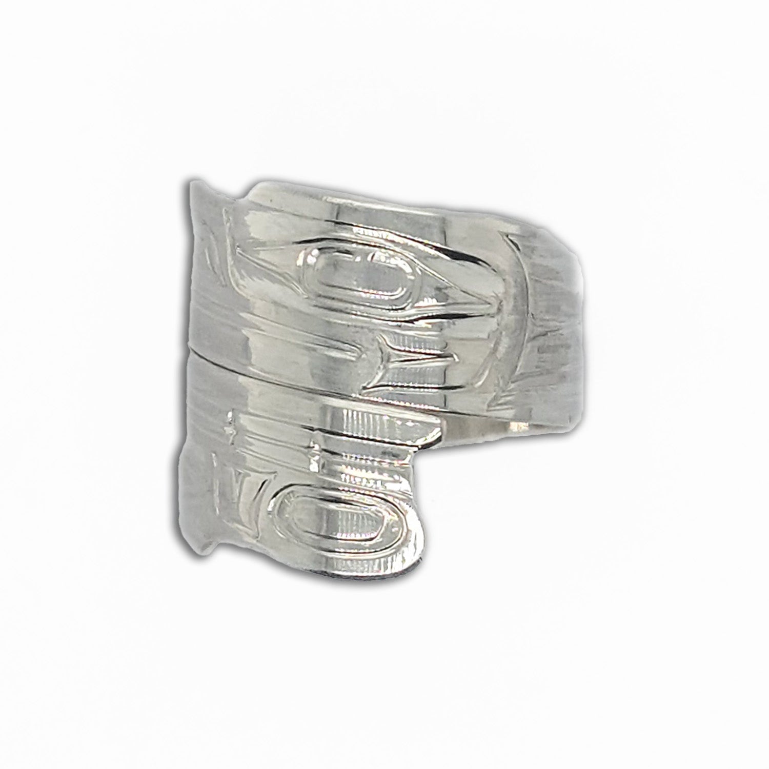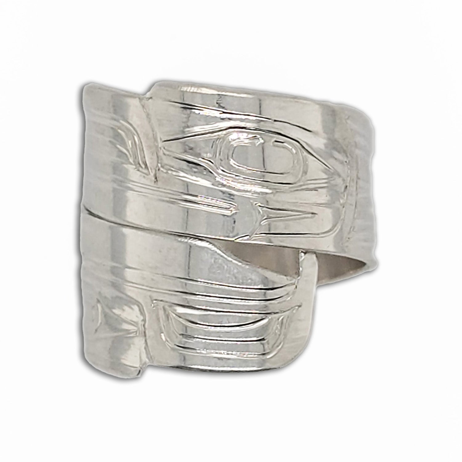 This Eagle and Raven Wrap Ring is hand-carved in sterling silver and signed by Haida artist Garner Moody.