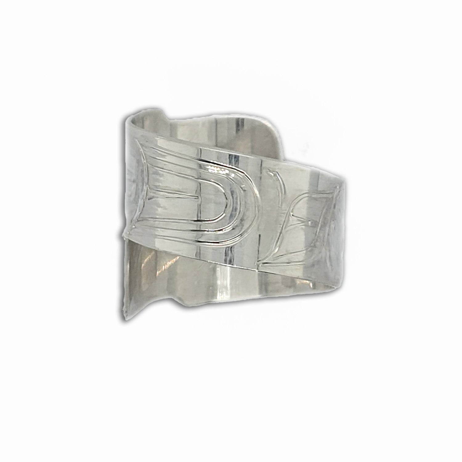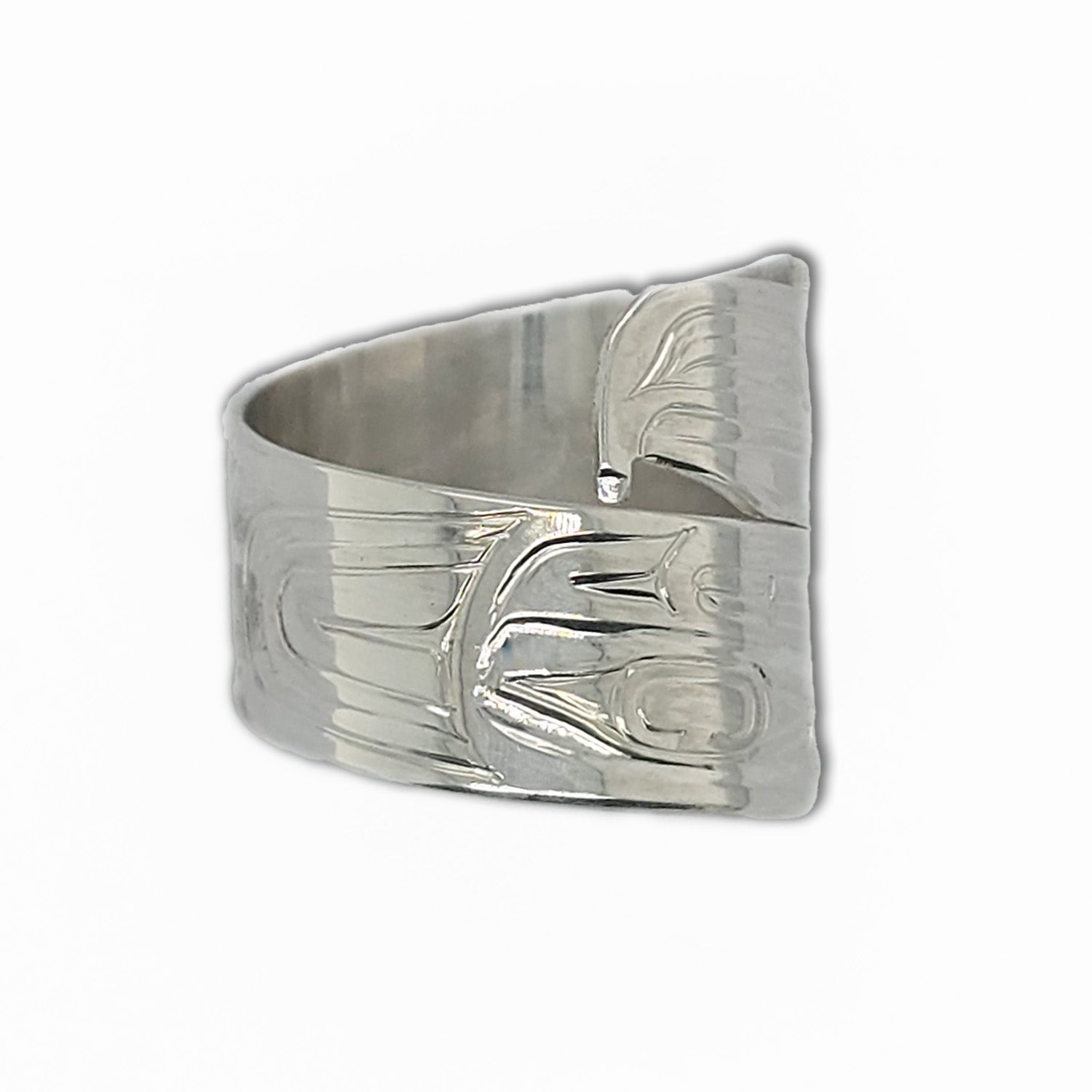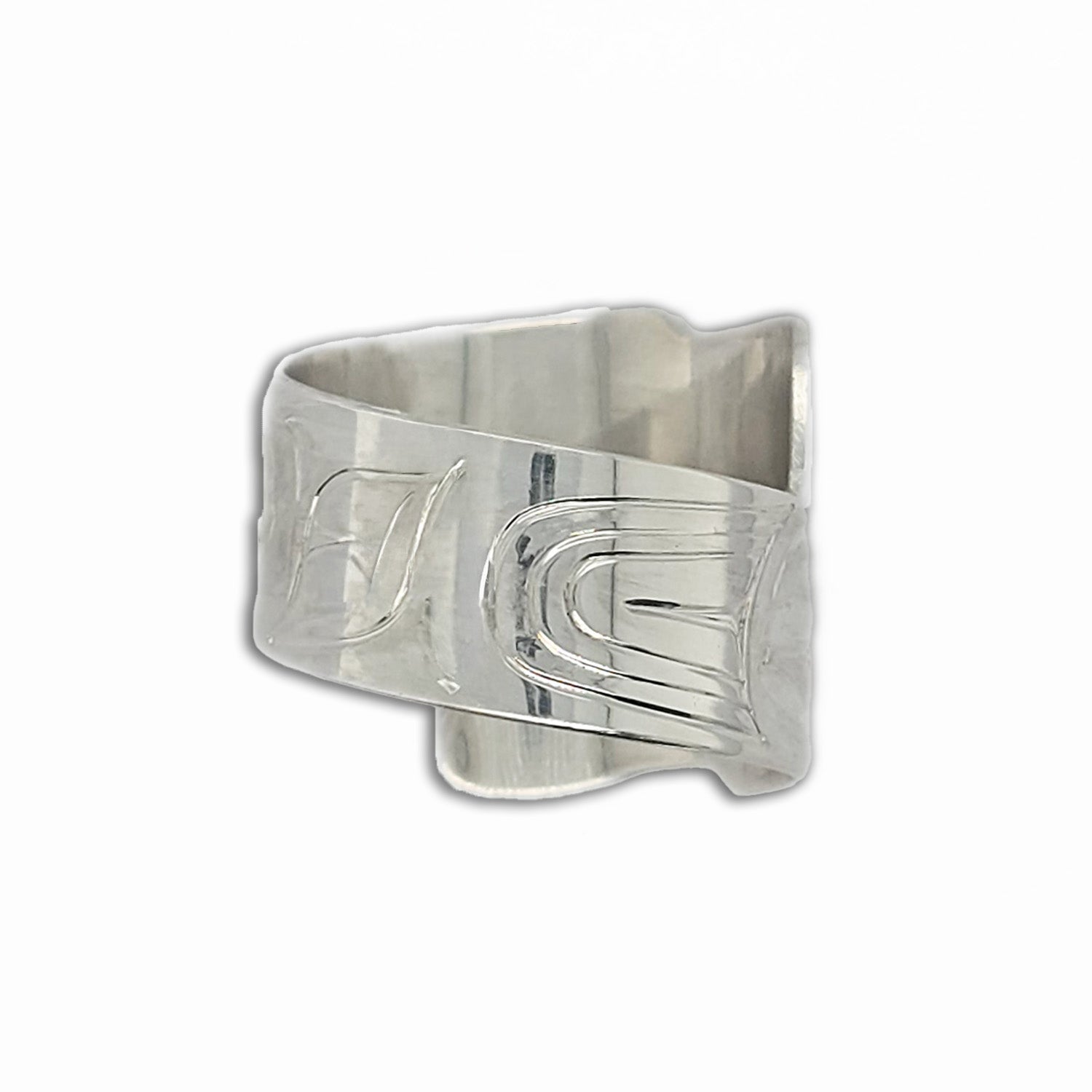 This Eagle and Raven Wrap Ring is hand-carved in sterling silver and signed by Haida artist Garner Moody.