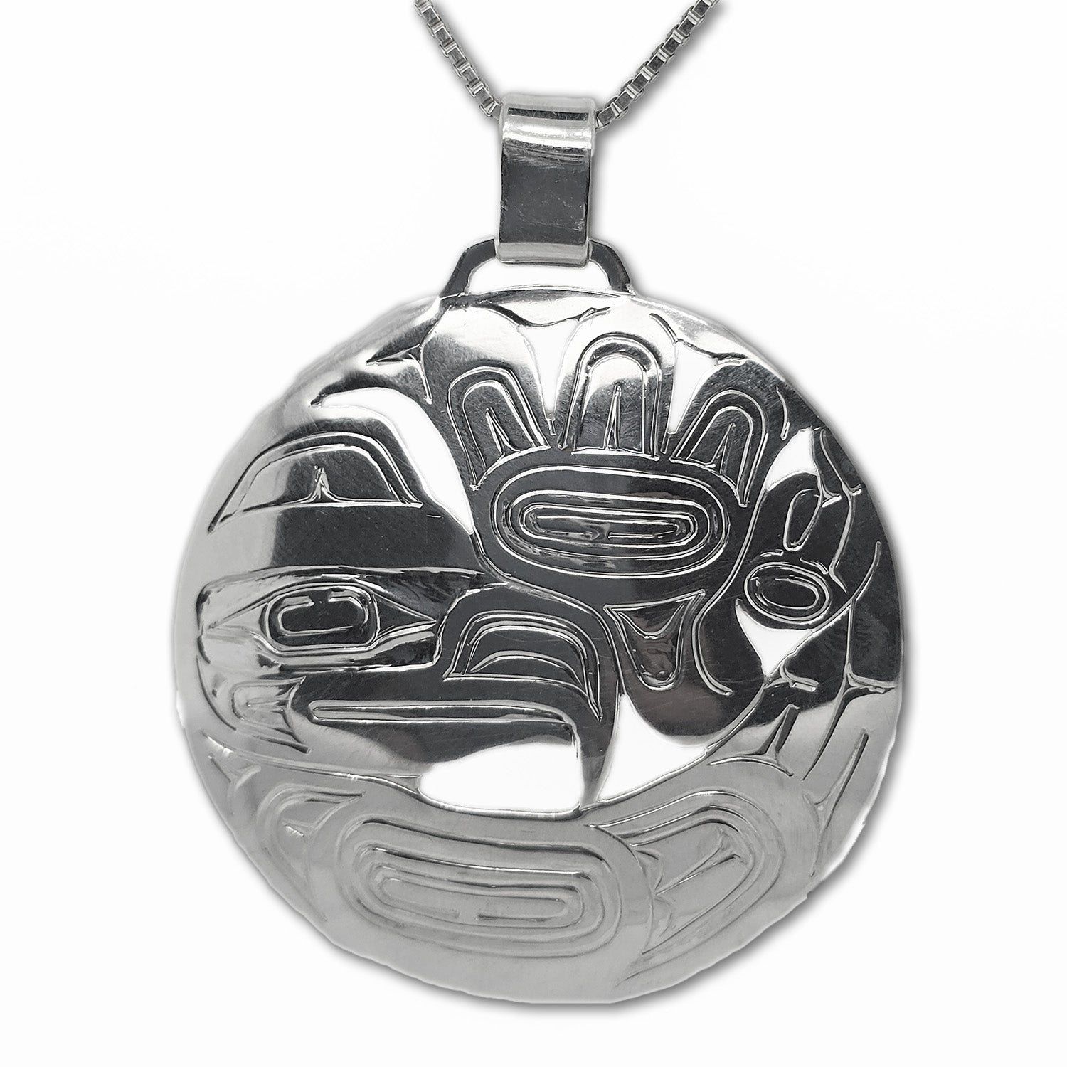 This Eagle Cut Out Pendant is hand-carved in sterling silver and signed by Haida artist Garner Moody.