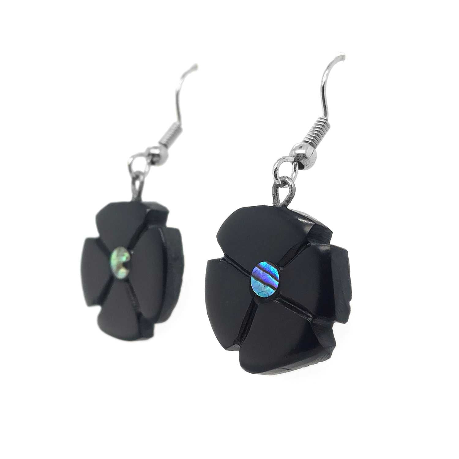 These Flower earrings were hand-carved by Haida artist Amy Edgars. The earrings have been carved in argillite and feature 2 abalone inlays in total.