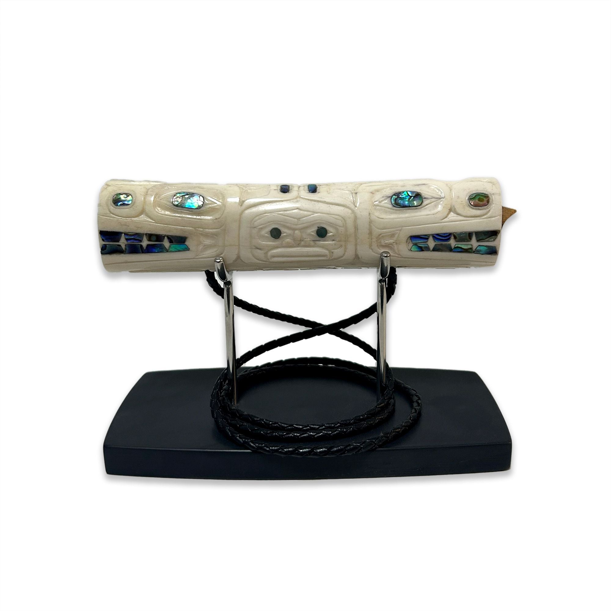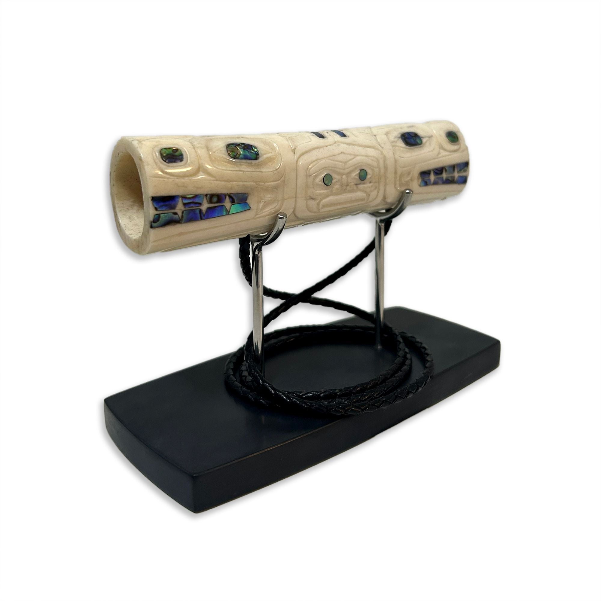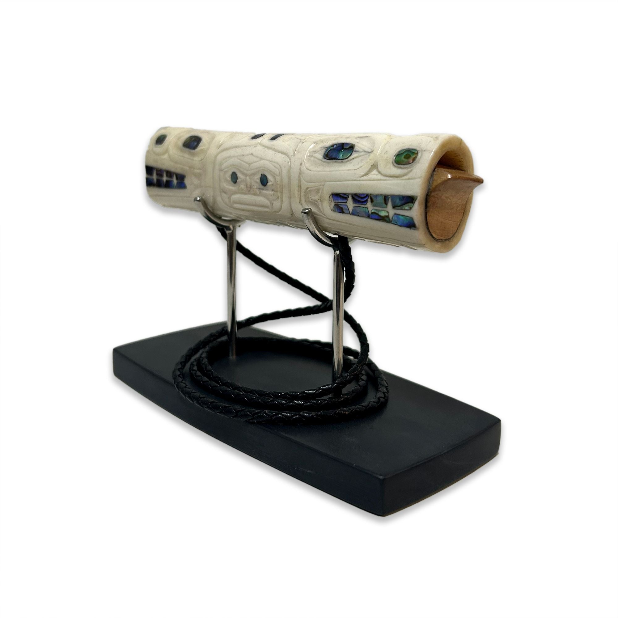 This Soul Catcher Whistle is hand-carved in ivory by Derek White from the Haida Nation. The whistle features abalone inlays and it is signed on the bottom. It comes with a stand and a piece of waxed black rope to hang the whistle around the neck. It was acquired from a  collection in good condition.