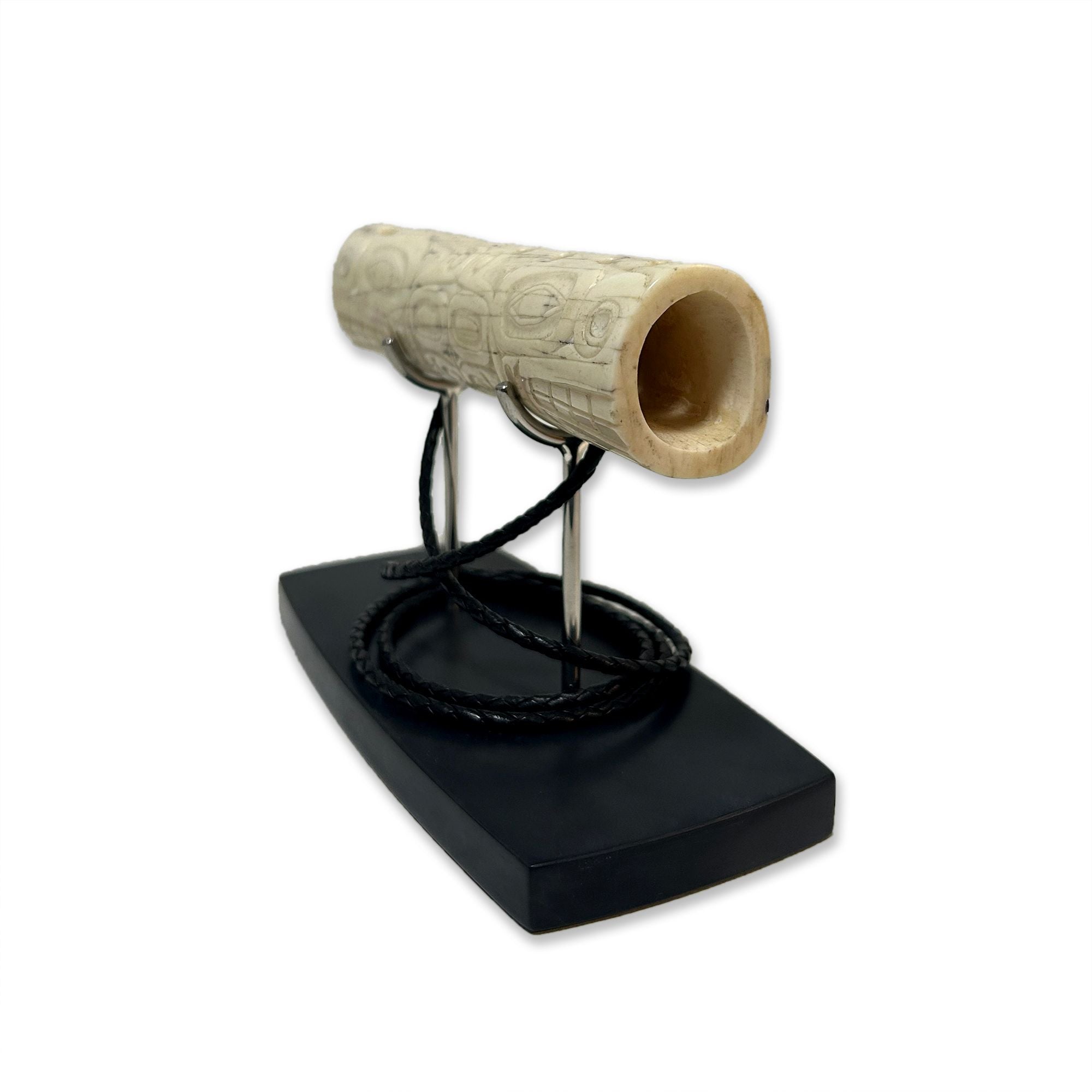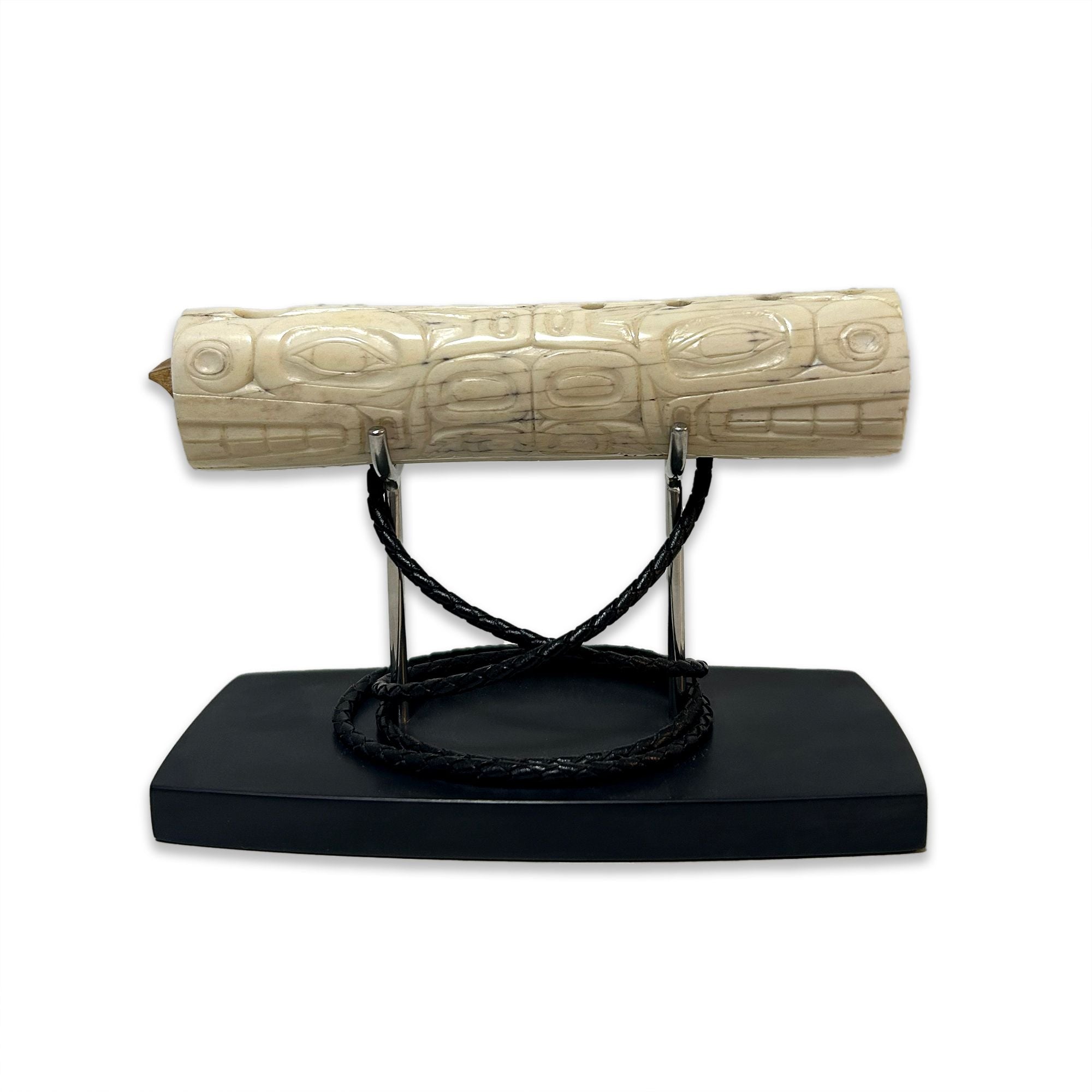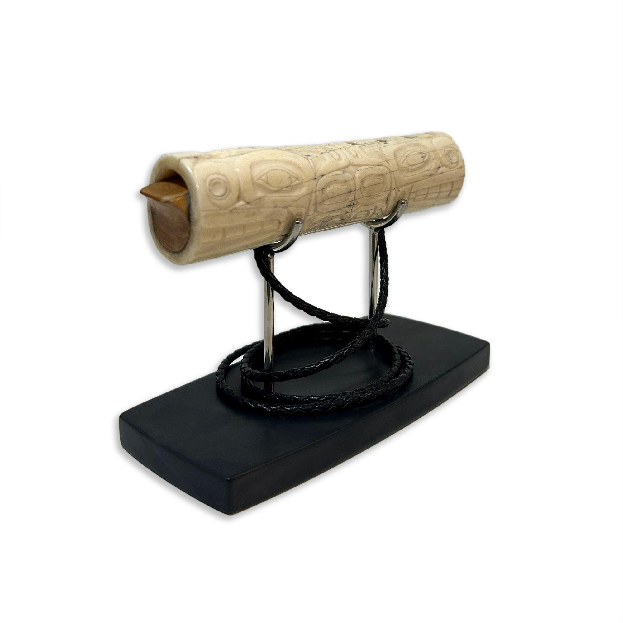 This Soul Catcher Whistle is hand-carved in ivory by Derek White from the Haida Nation. The whistle features abalone inlays and it is signed on the bottom. It comes with a stand and a piece of waxed black rope to hang the whistle around the neck. It was acquired from a  collection in good condition.