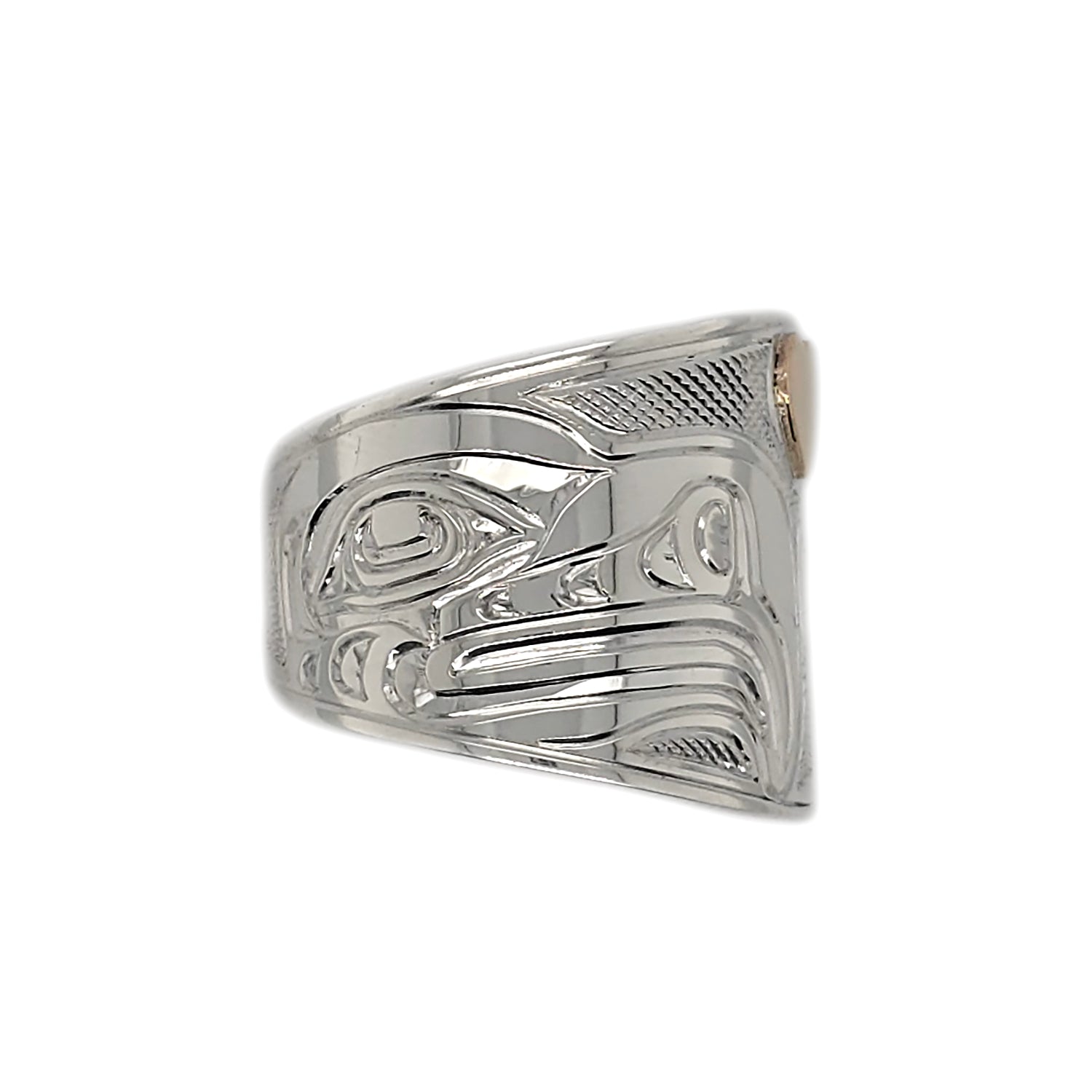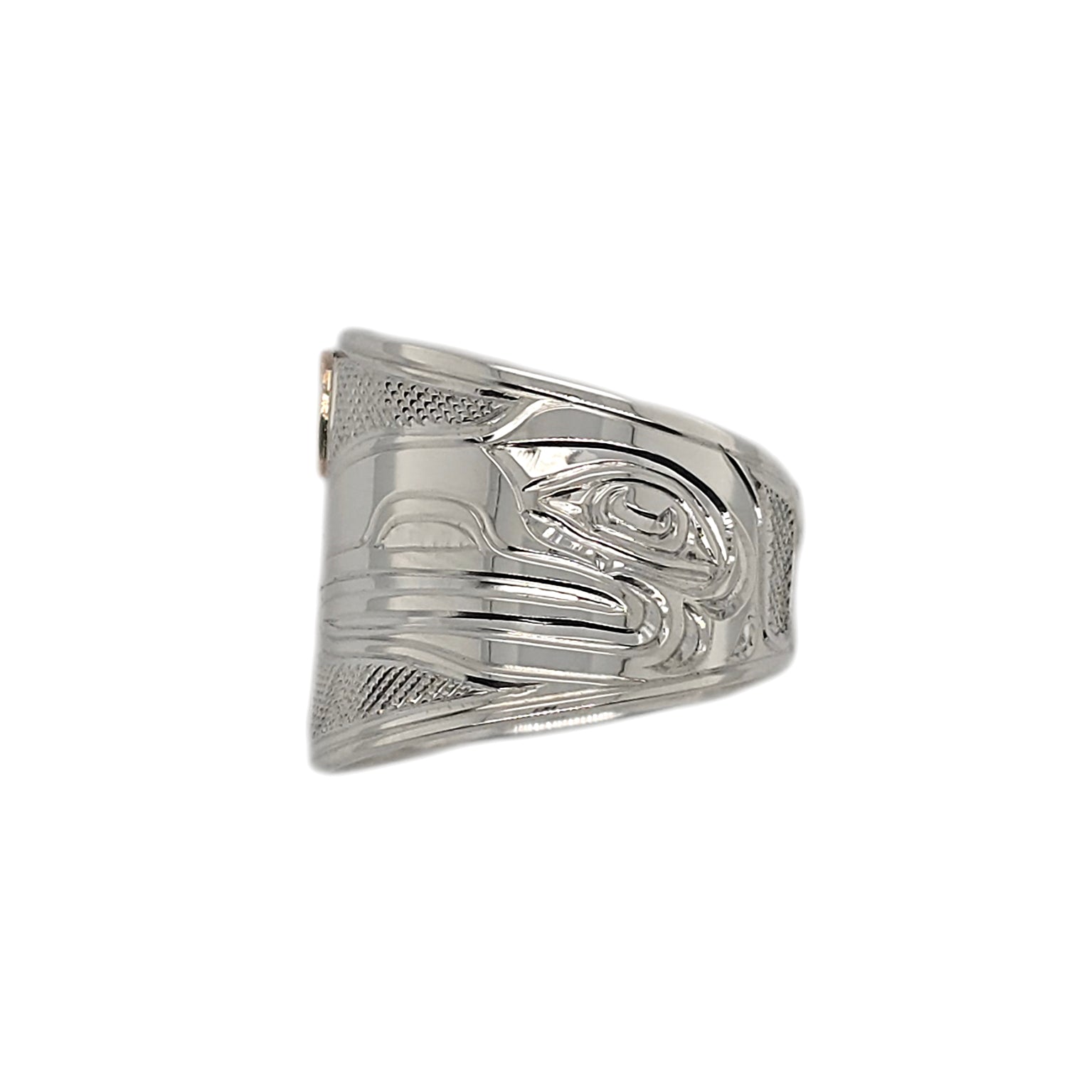 Sterling silver Love Bird Ring with a 14 karat gold heart carved by Chris Cook from the Kwakwaka'wakw Nation.