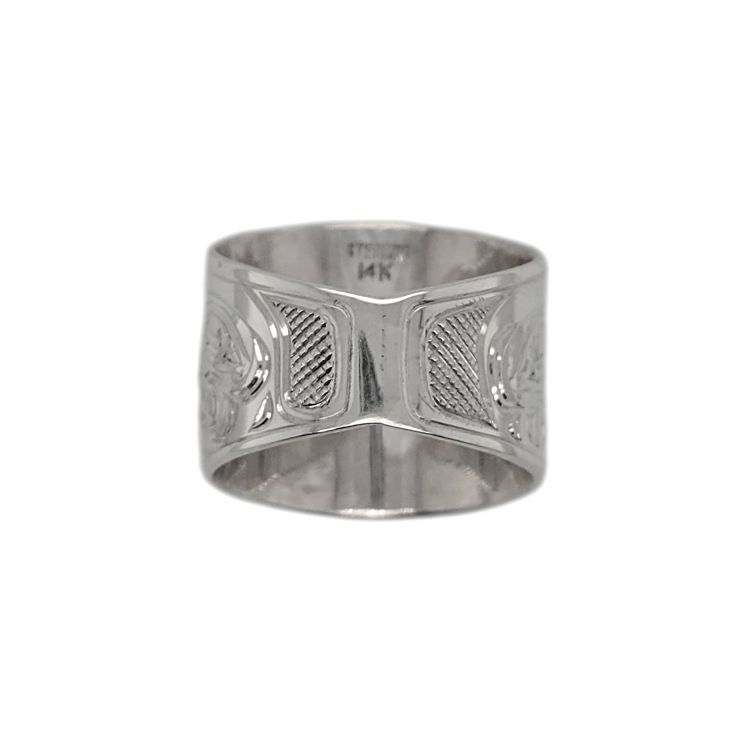 The Raven Crest and the Eagle Crest represent two important crests for Northwest Coast Peoples. This ring symbolizes love and harmony between all people.