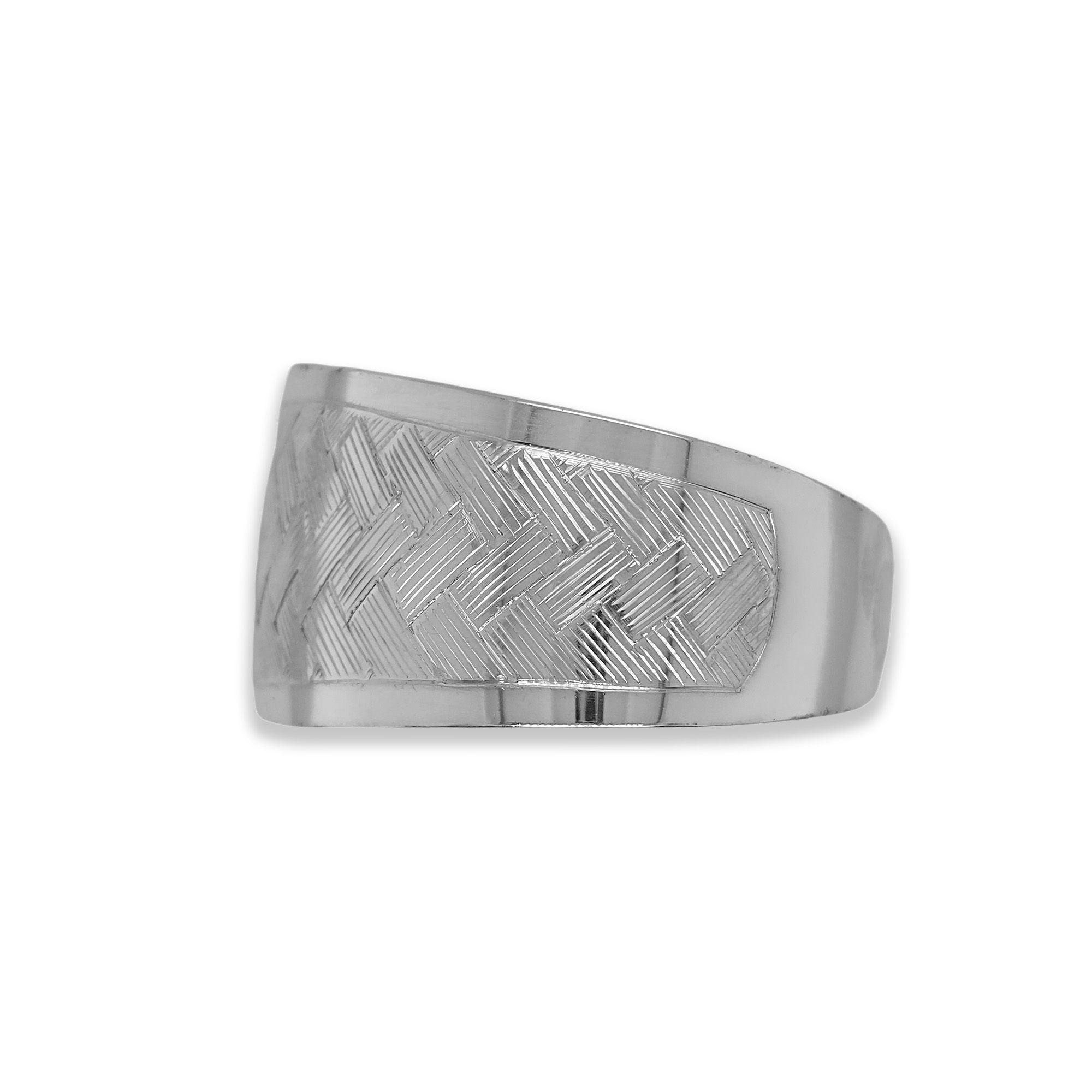 This bracelet measures approximately 1 inch or 2 1/2 centimeters wide at the widest section, and it is tapered to 1/2 an inch or 1 1/2 centimeters wide, by 6 inches or 15 centimeters long (not including the gap).