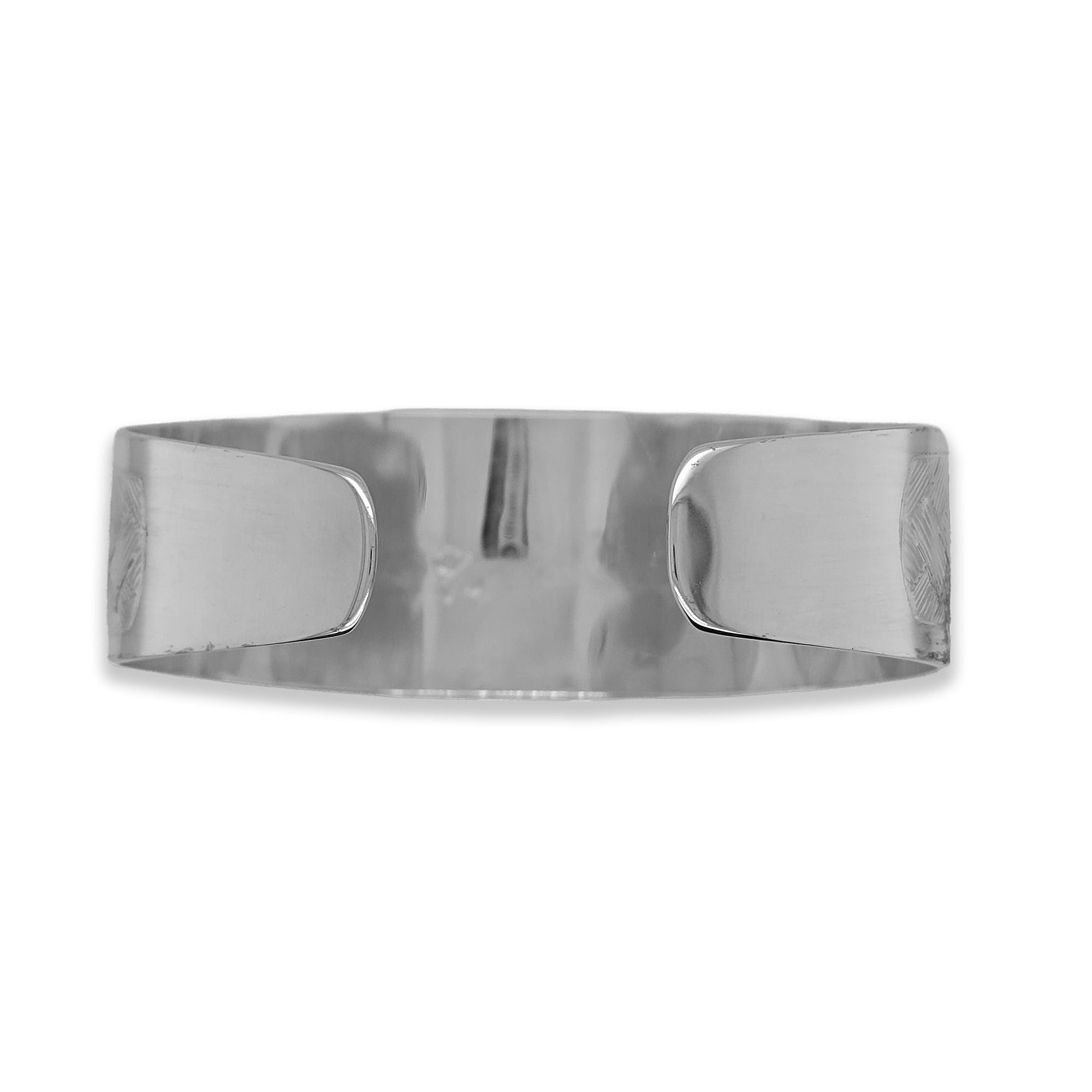 This Hummingbird and Honeysuckle Tapered Bracelet was hand carved in sterling silver by Coast Salish artist Jody Sparrow. It features a Hummingbird and Honeysuckle design.