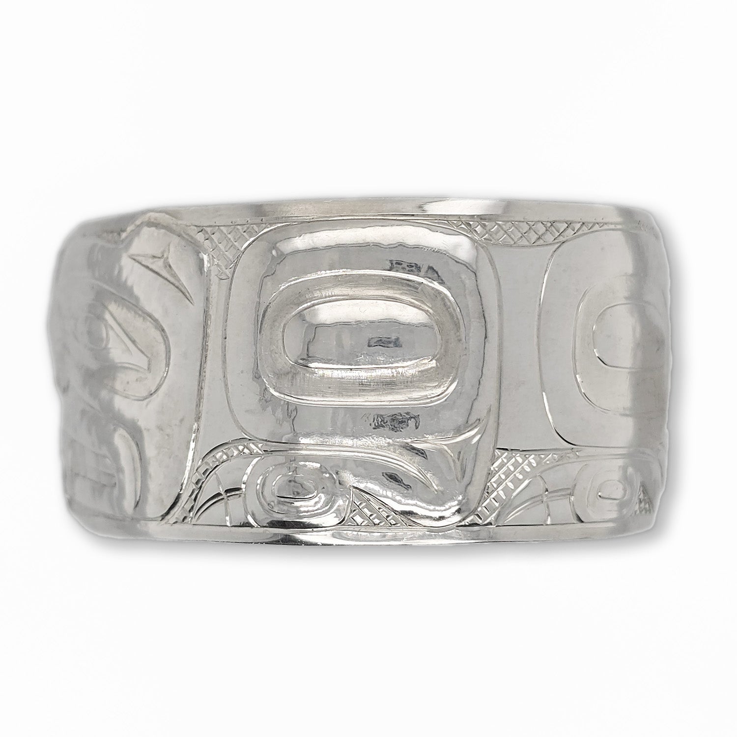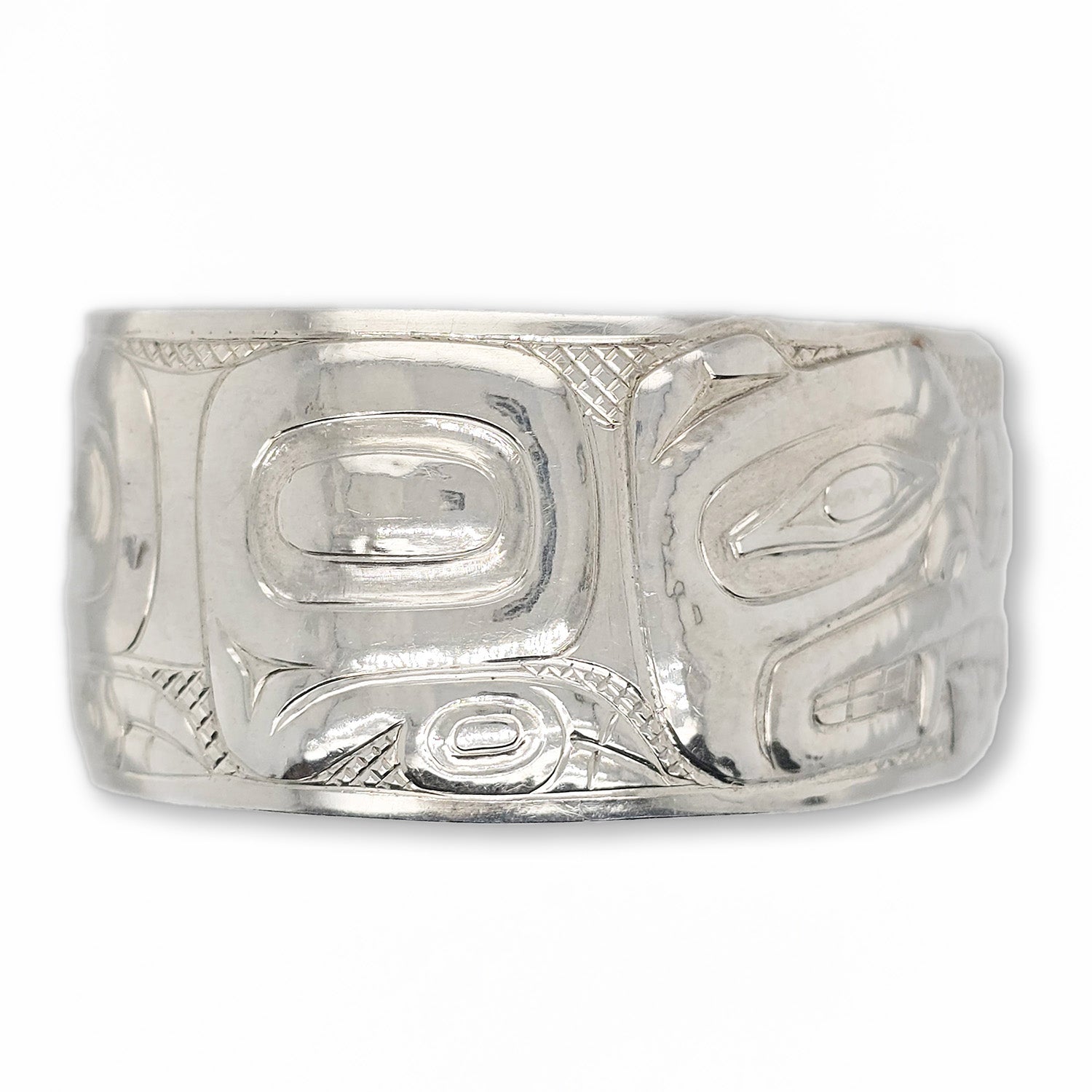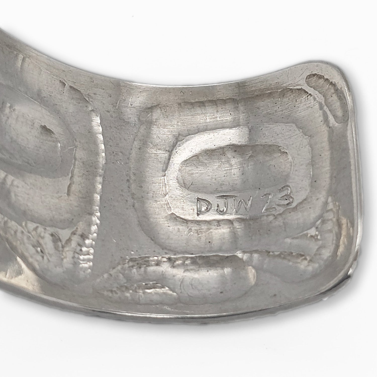 This Bear Silver Repousse Bracelet has been hammered, hand-carved in sterling silver by Haida artist Derek White from the Haida Nation. It is signed in the inside.