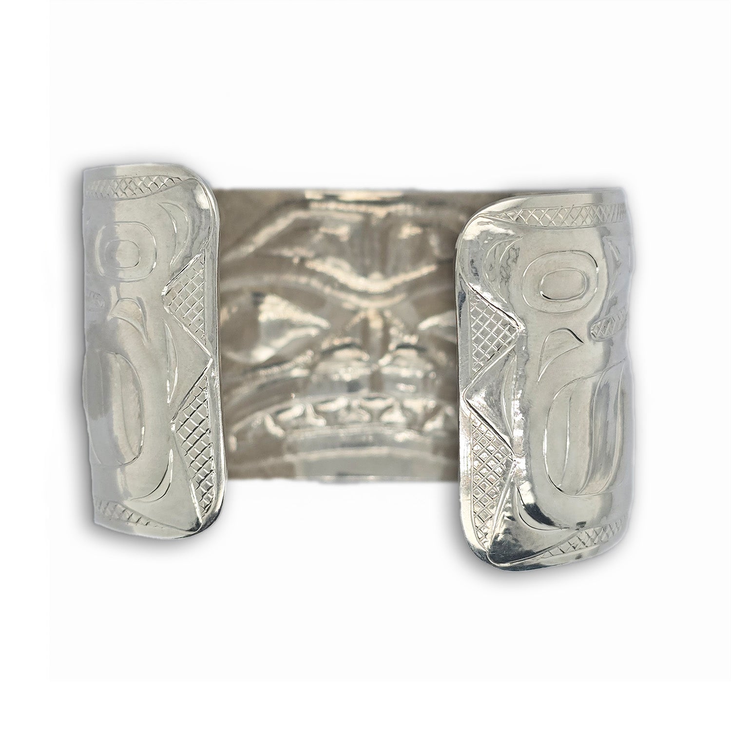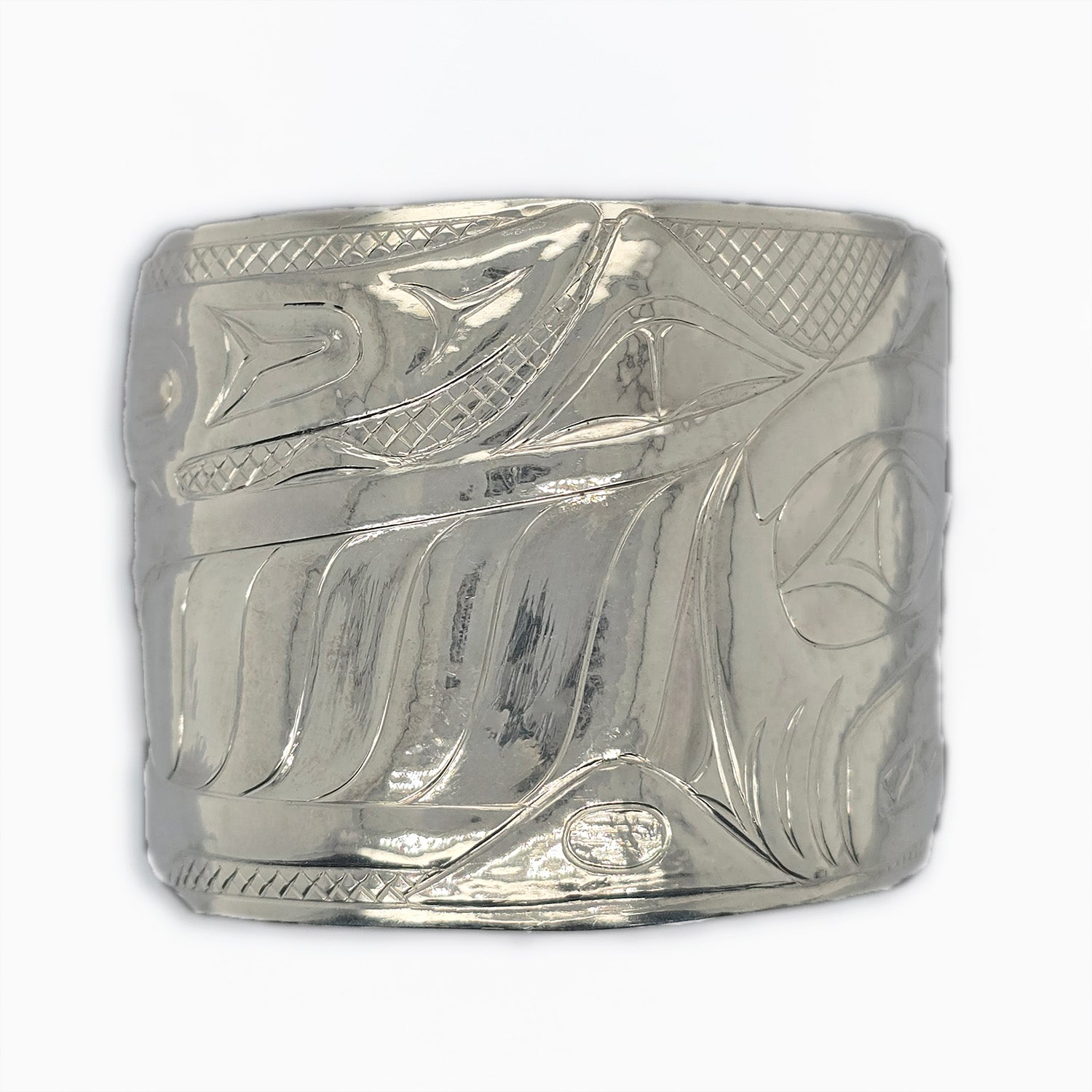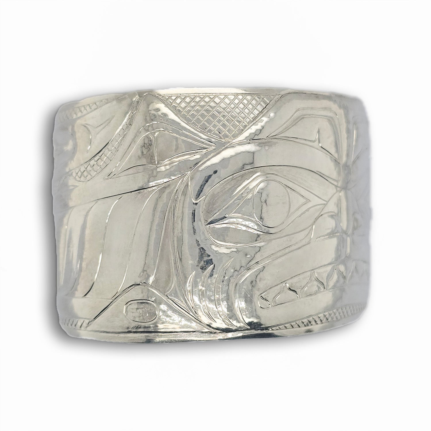 This Dogfish Repousse Repousse Bracelet has been hammered and hand-carved in sterling silver by Haida artist Derek White from the Haida Nation. It is signed on the inside.