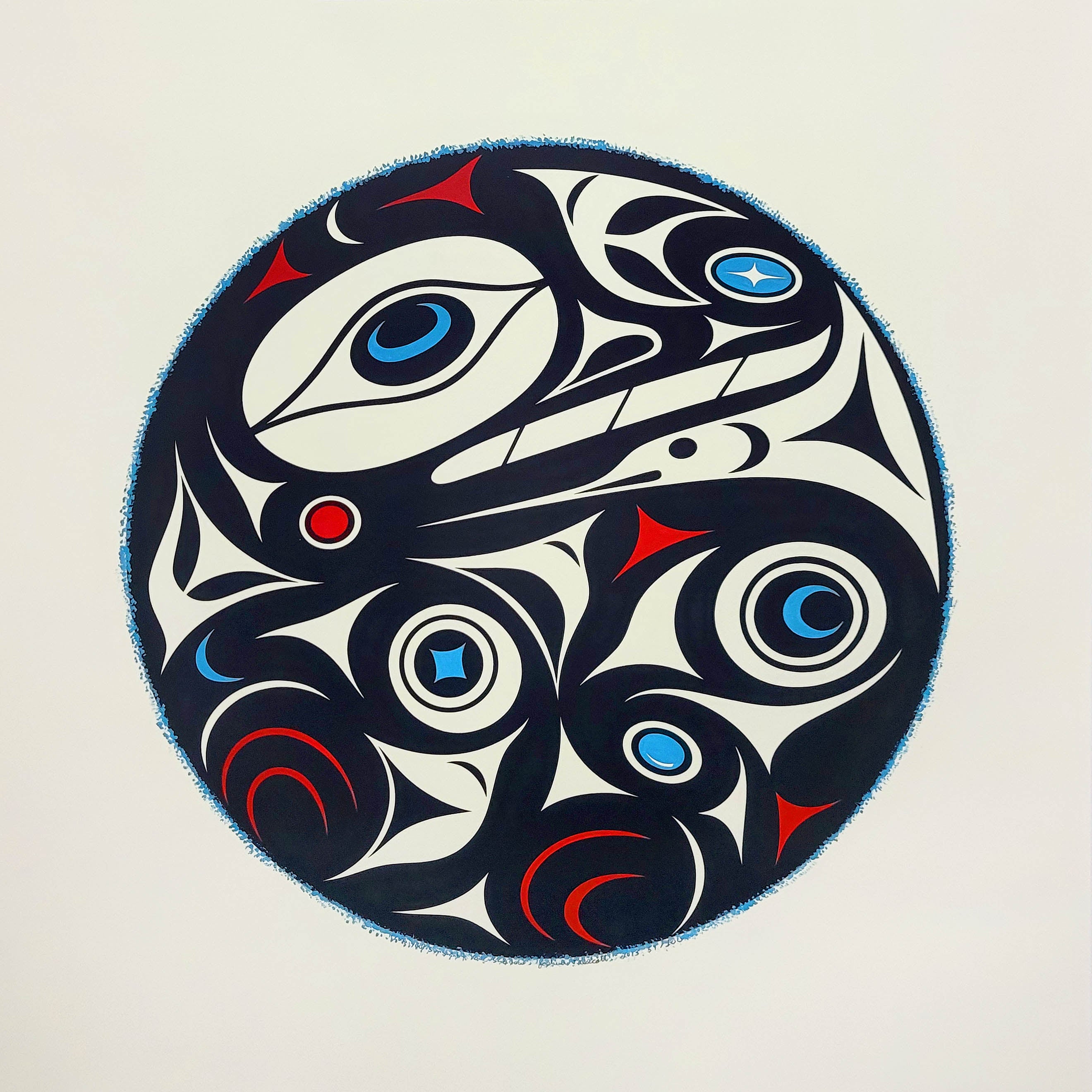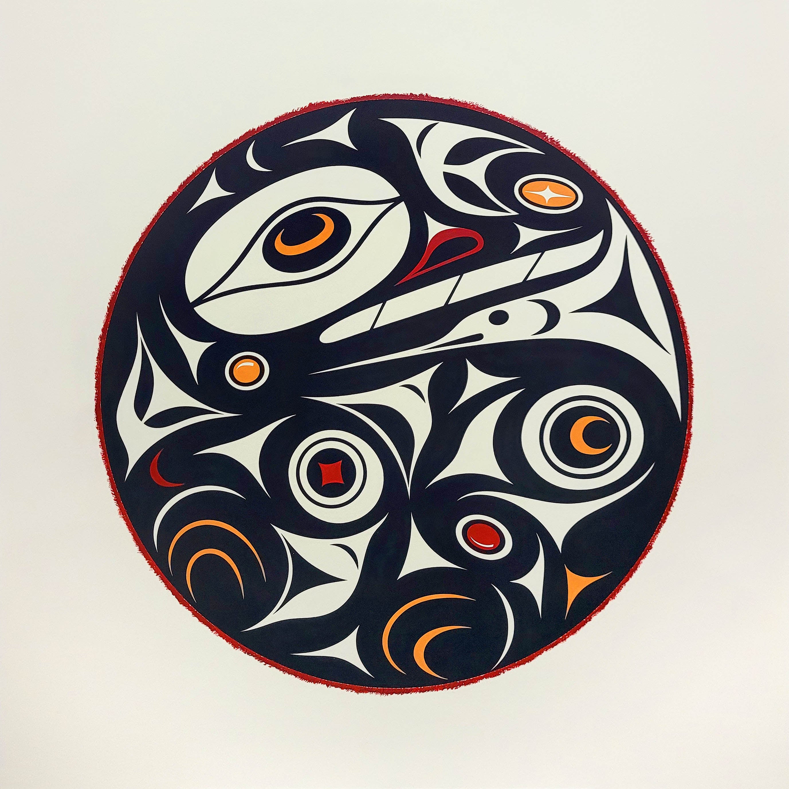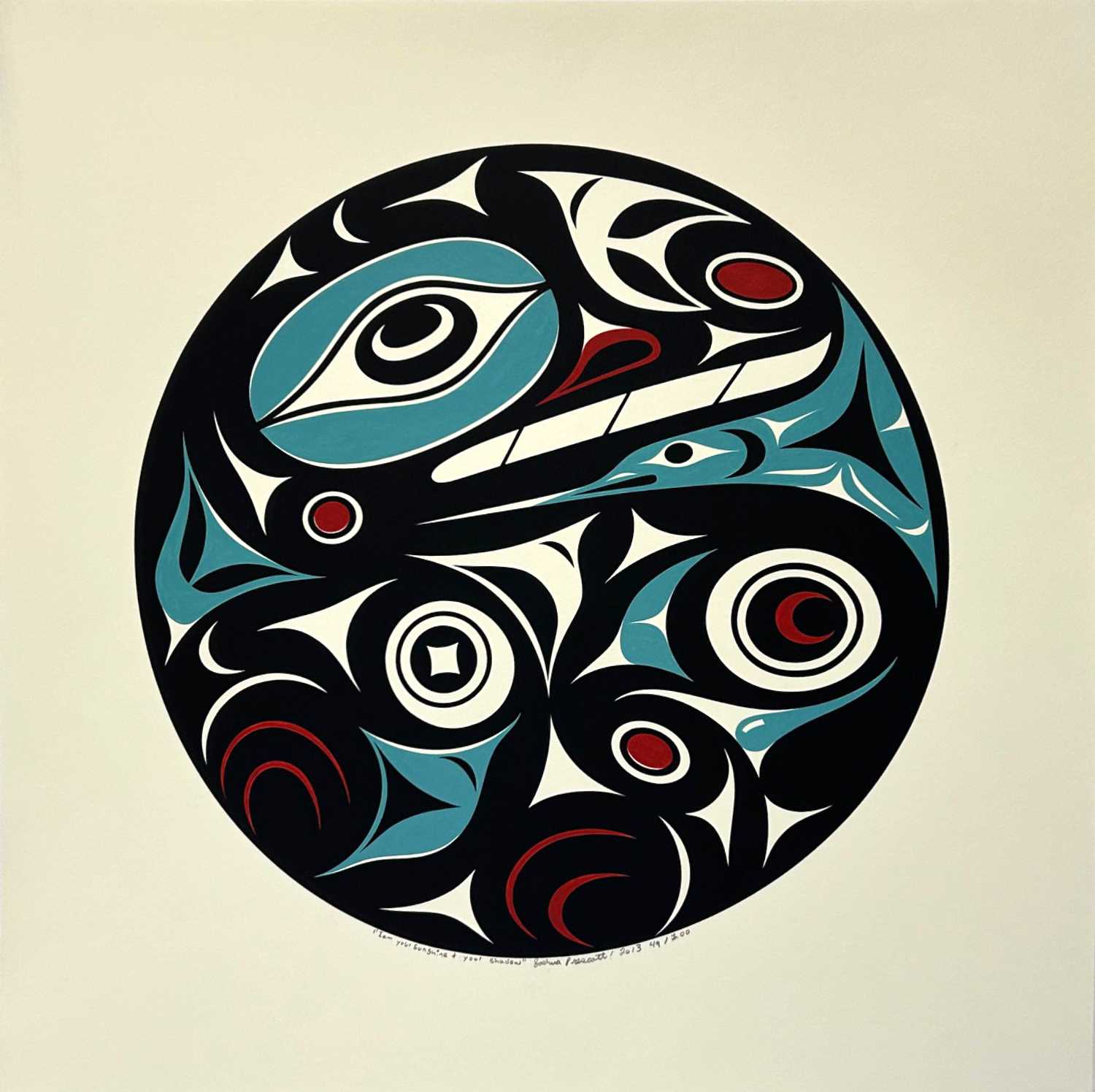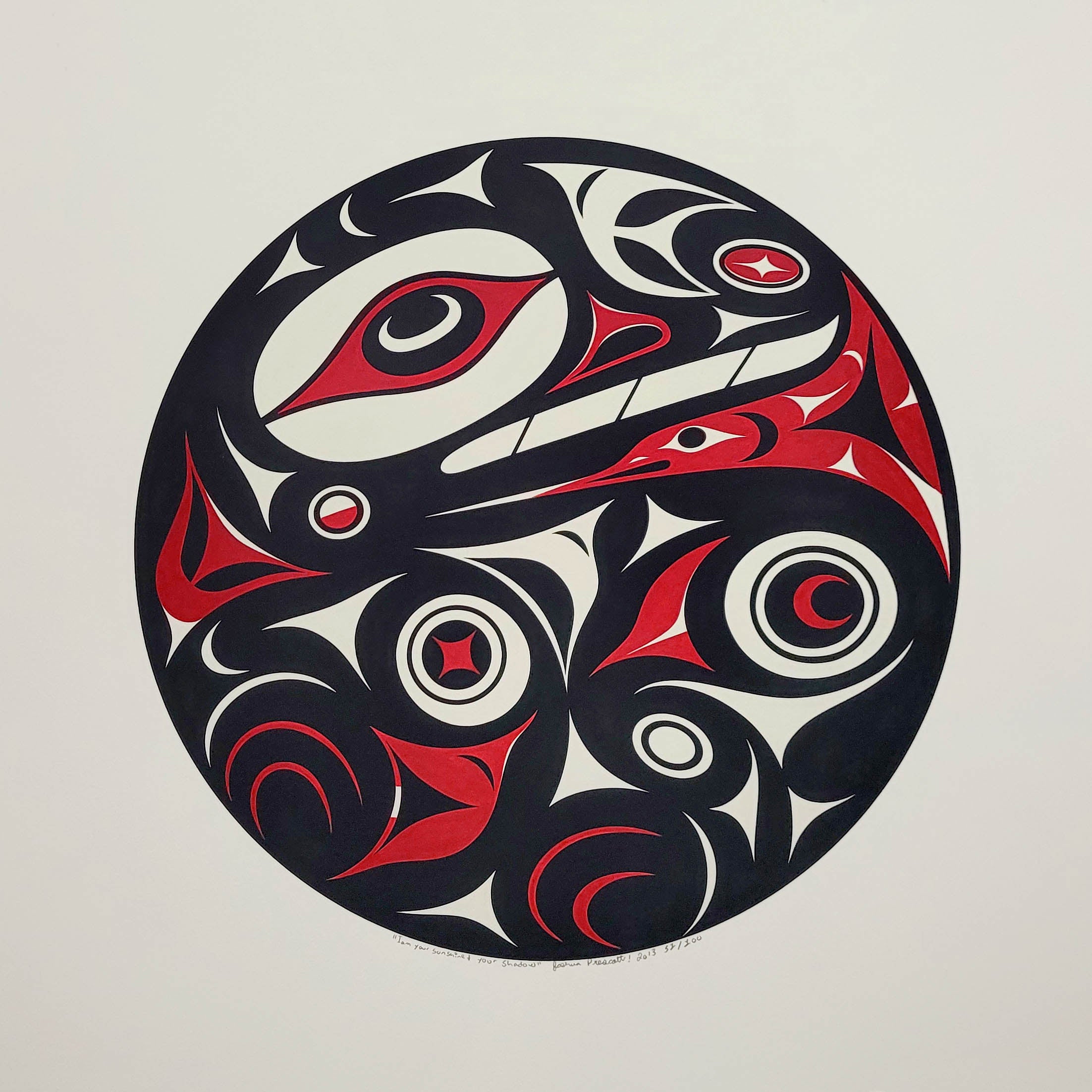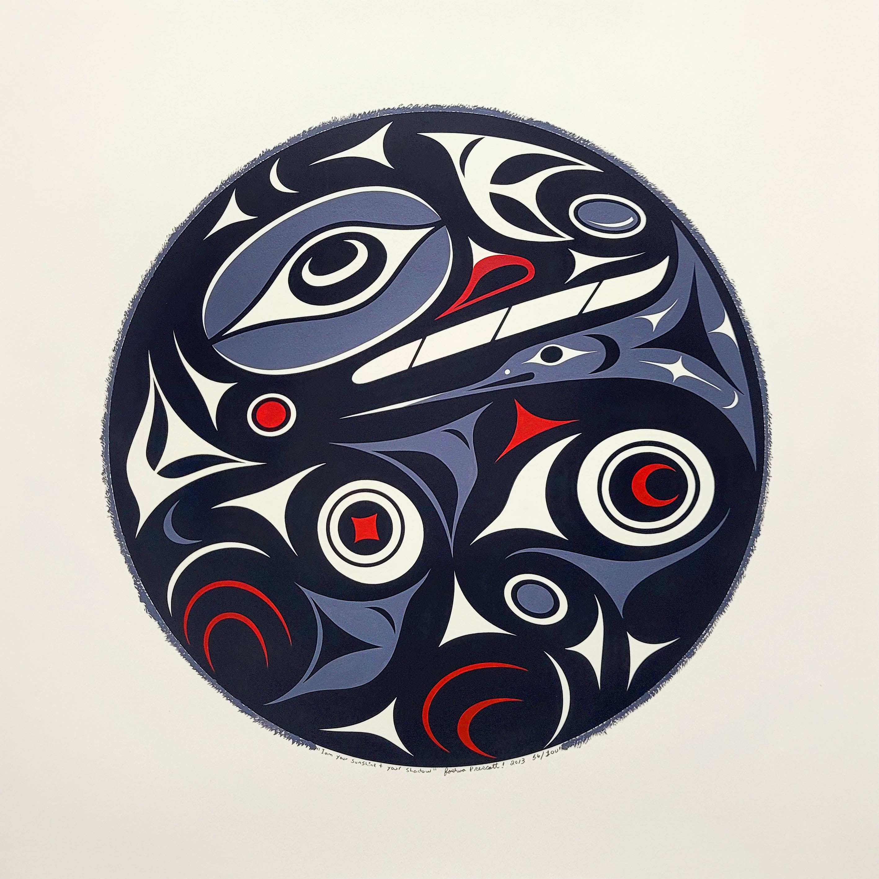 This I Am Your Sunshine and Your Shadow limited edition signed print was created by Nuu-chah-nulth artist Joshua Prescott. The print is about 19 1/2 inches or 49 1/2 centimeters square and has an edition size of 100. Joshua has created unique variants within this edition of prints - while some prints have been silkscreened only, others have the addition of hand-painted design elements.