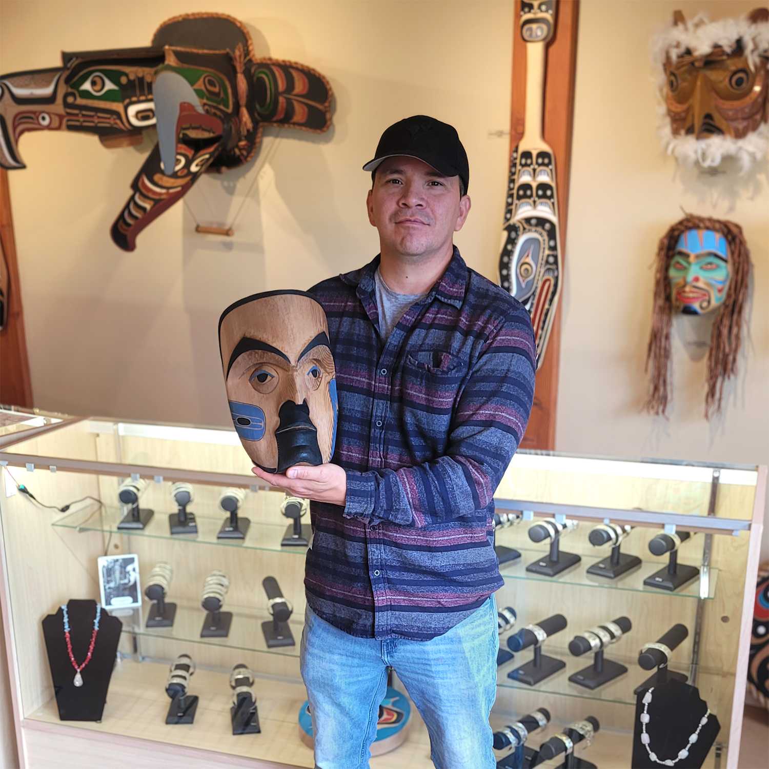 Raven is a central figure in Northwest Coast Indigenous culture, often depicted as a trickster and transformer. In human form, Raven is portrayed as a clever, mischievous being who possesses both human and supernatural traits. He is known for his shape-shifting abilities, enabling him to move between animal and human worlds, bringing about change or chaos, yet often inadvertently benefiting humanity.