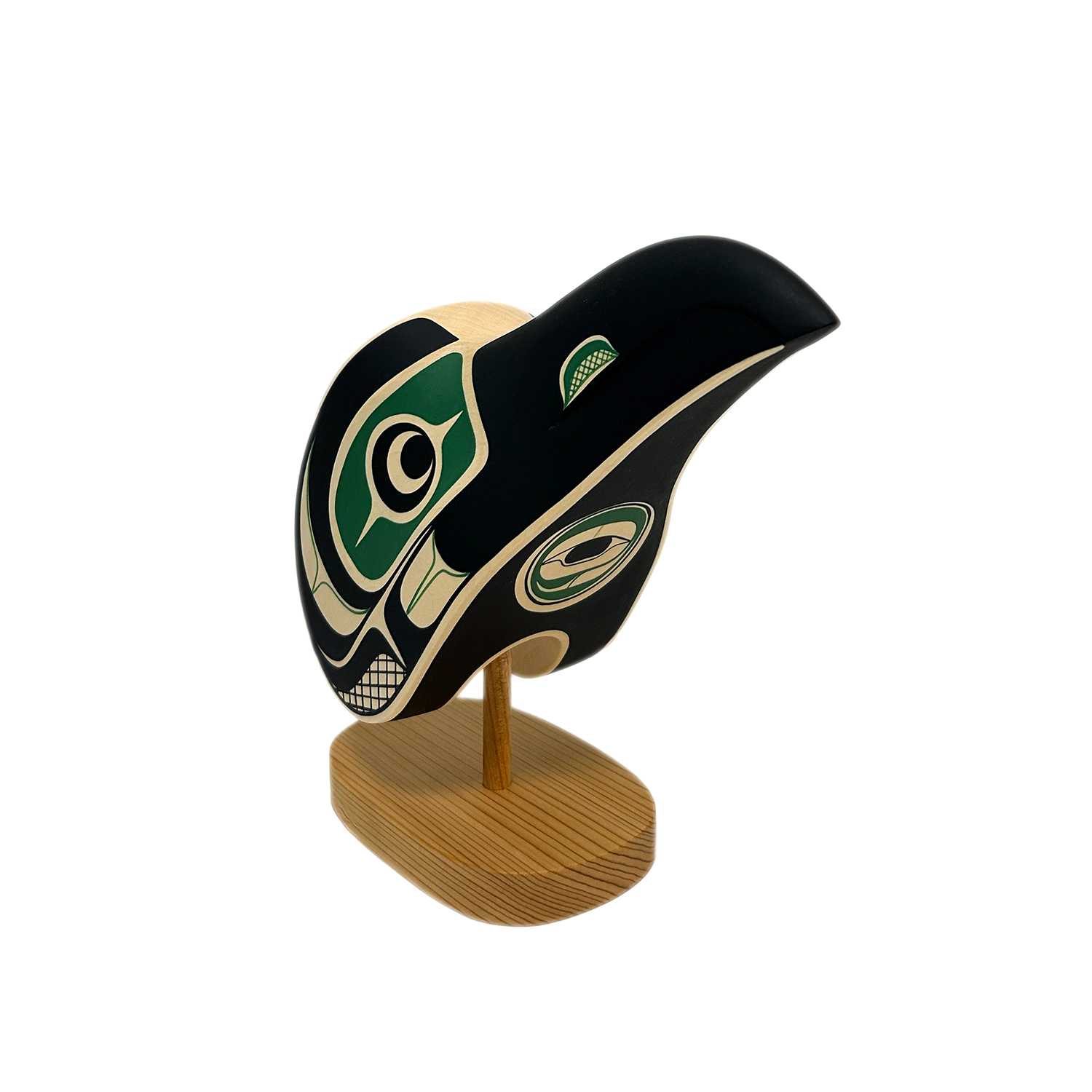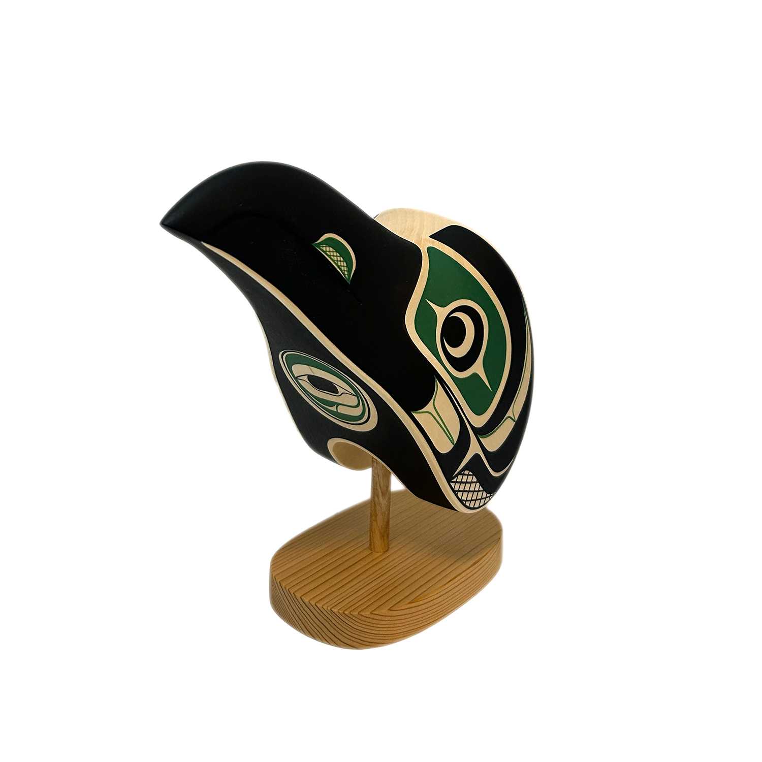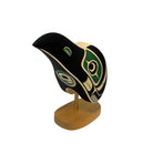 This Raven Maskette is hand-carved and painted by Kwakwaka'wakw artist Rod Smith. It has been carved from basswood, sits on a removable red cedar base, and have been painted in black and blue acrylic. Rod is perhaps best known for his precise and elegant painting style.