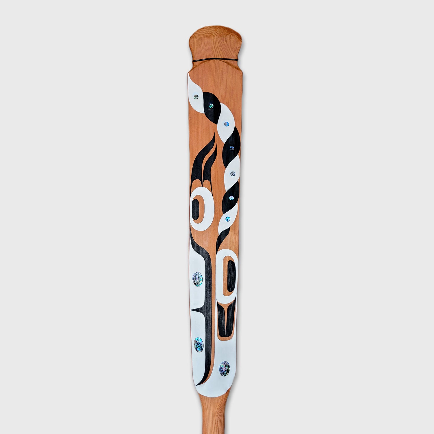 This Wolf Paddle was created by Kwakwakwa'wakw artist Jessica Chickite of the Wei Wai Kai First Nation. It was carved in red cedar by her partner Cody Lafrance, then hand-painted with black and white acrylic by Jessica. She then inlayed it with 21 abalone shells.