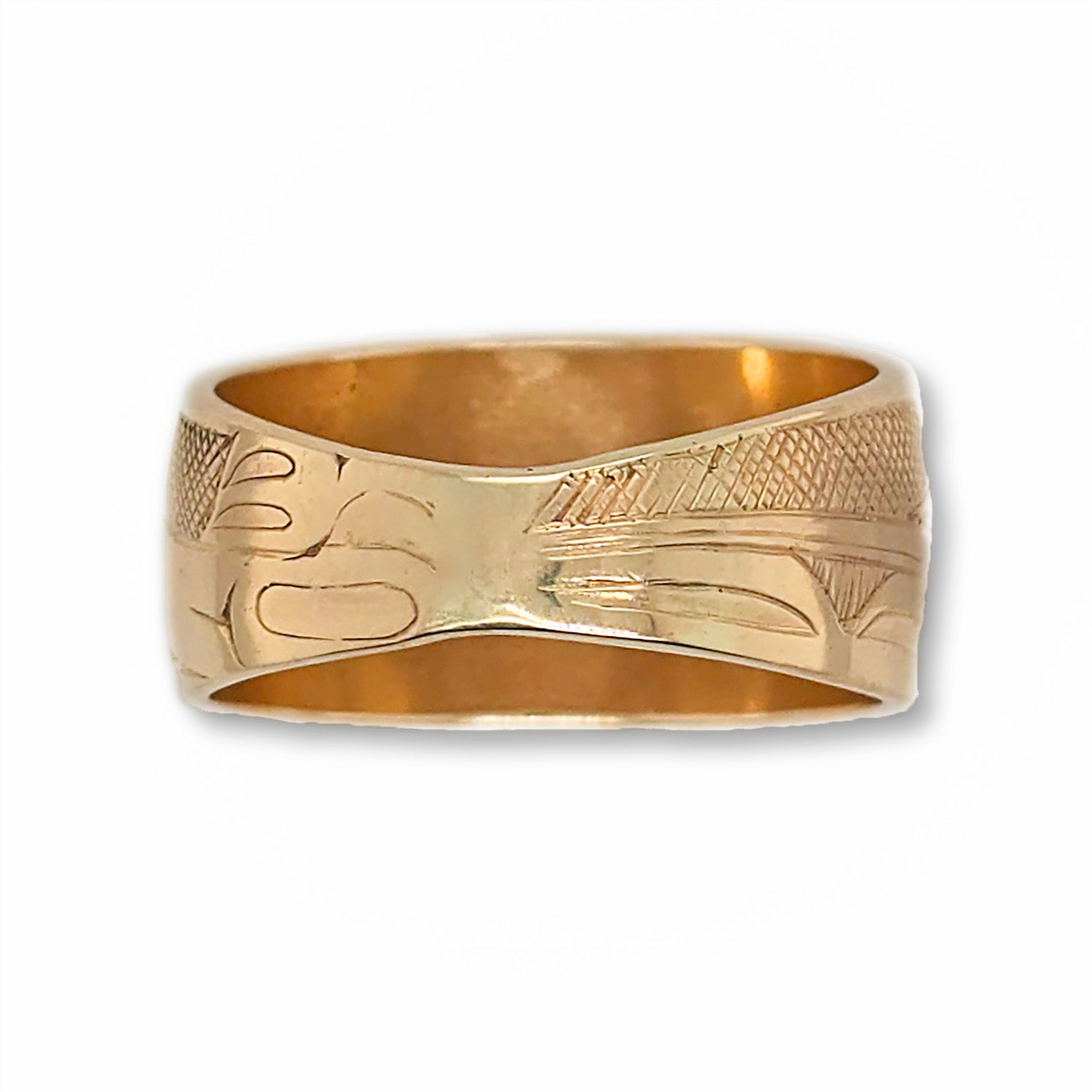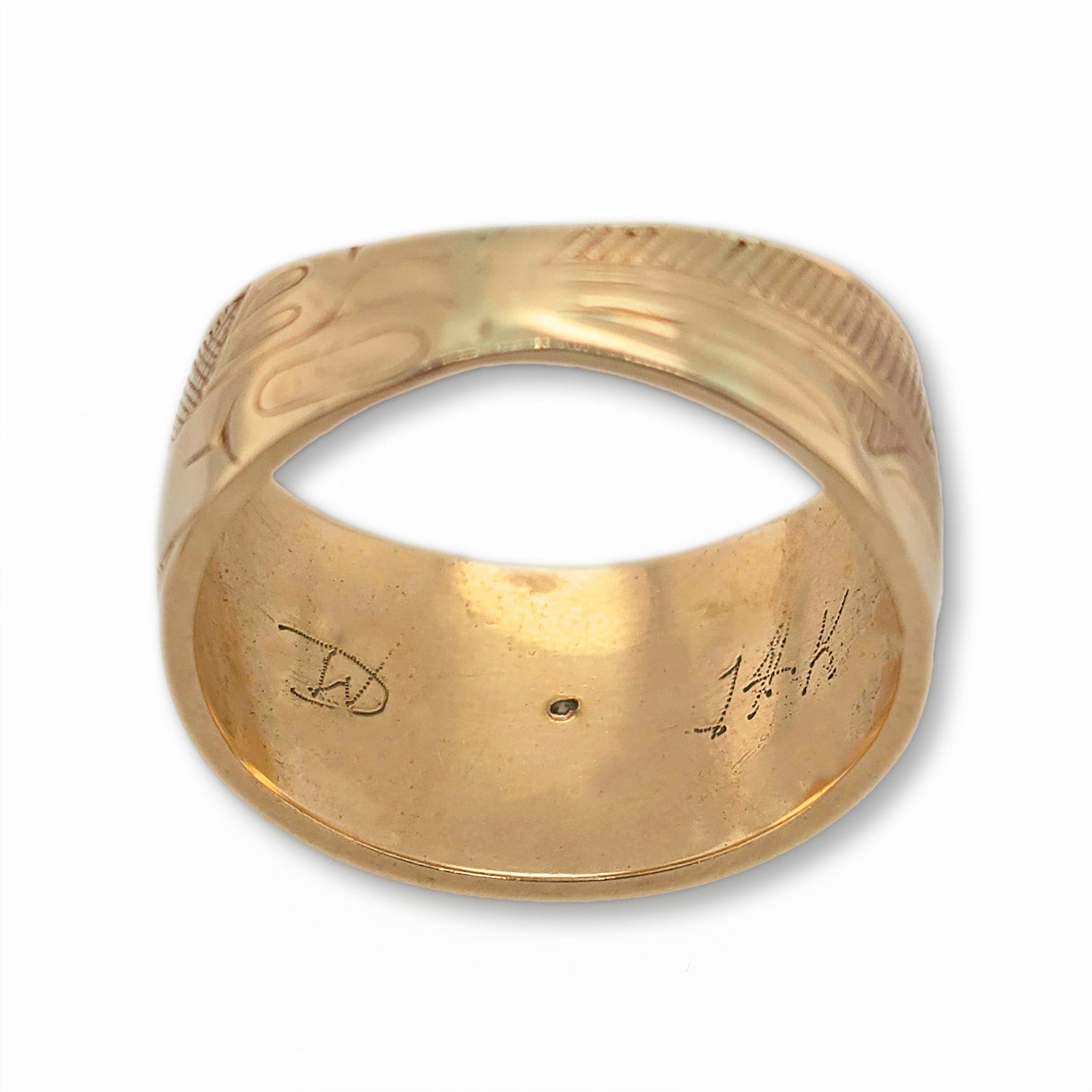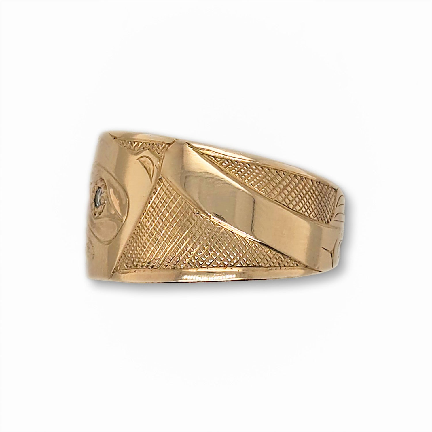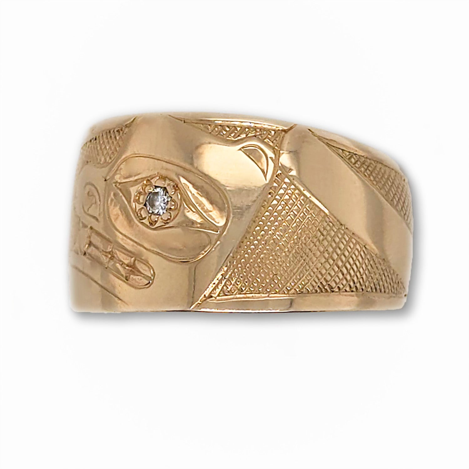 This Gold Bear Ring is hand-carved in 14-karat gold by Haisla artist Derek Wilson. It features a diamond in the eye and it is signed on the inside. It was acquired from a collection and is in good condition.