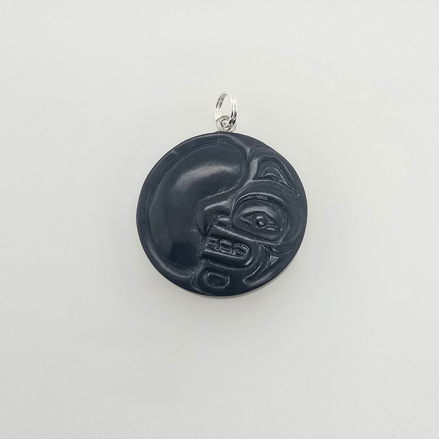 This Woman in the Moon pendant is hand-carved in argillite by Haida artist Gryn White.