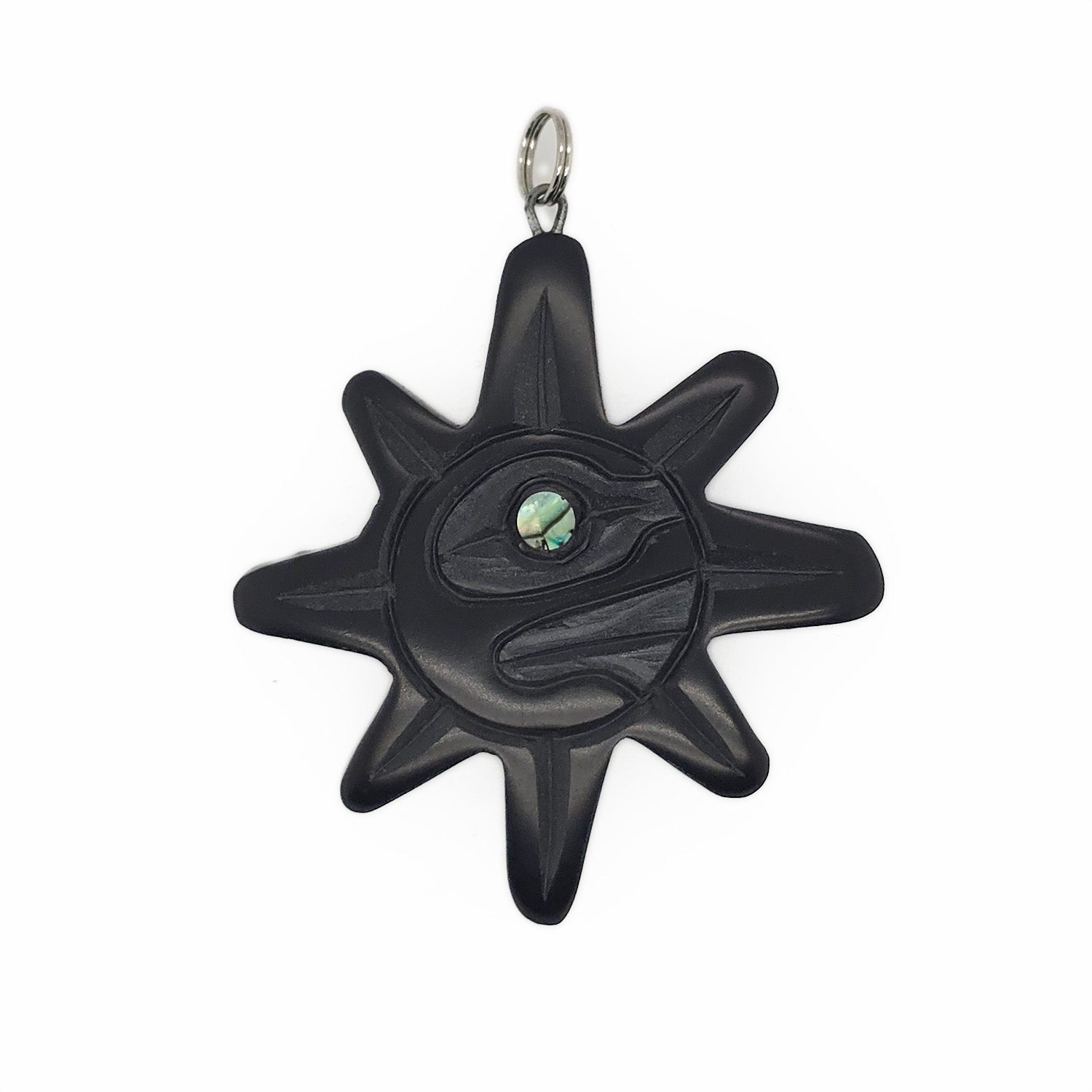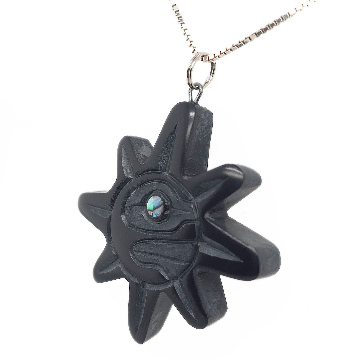 This Sun Pendant has been hand-carved by Haida artist Amy Edgars. The pendant has been carved in argillite and features 1 abalone inlay.