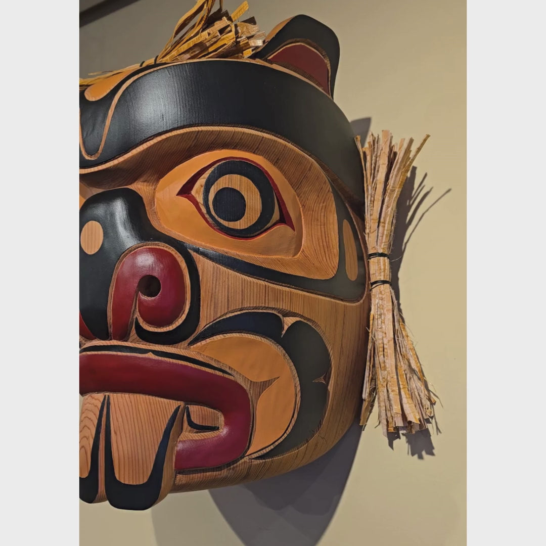 This Beaver Mask is carved and painted by Bill Henderson from the Kwakwaka´wakw Nation. It has been carved from red cedar, painted with acrylic, and adorned with cedar bark.