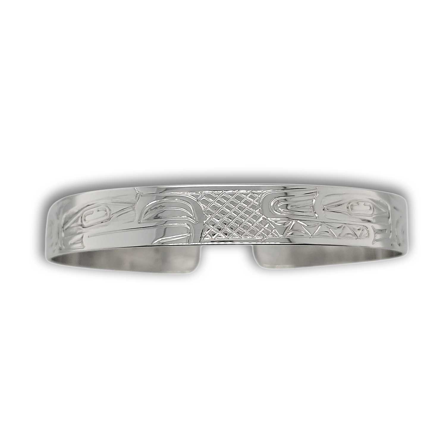 This Eagle and Orca 3/8" Bracelet is hand-carved in sterling silver by Haida artist Garner Moody.