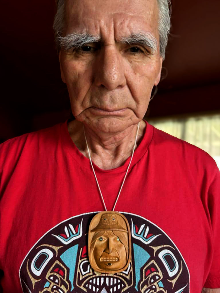 This Bear Mother Pendant has been expertly hand-carved in yew wood by the Haida Master Carver Ron Russ. Yew is a type of hardwood from Haida Gwaii that can be found in small quantities on the islands. It is often employed by Haida carvers for intricate fine jewelry work and small carvings. The pendant features abalone inlays in the eyes of both the noblewoman and her bear hat, along with an 18 karat gold inlay representing the labret.