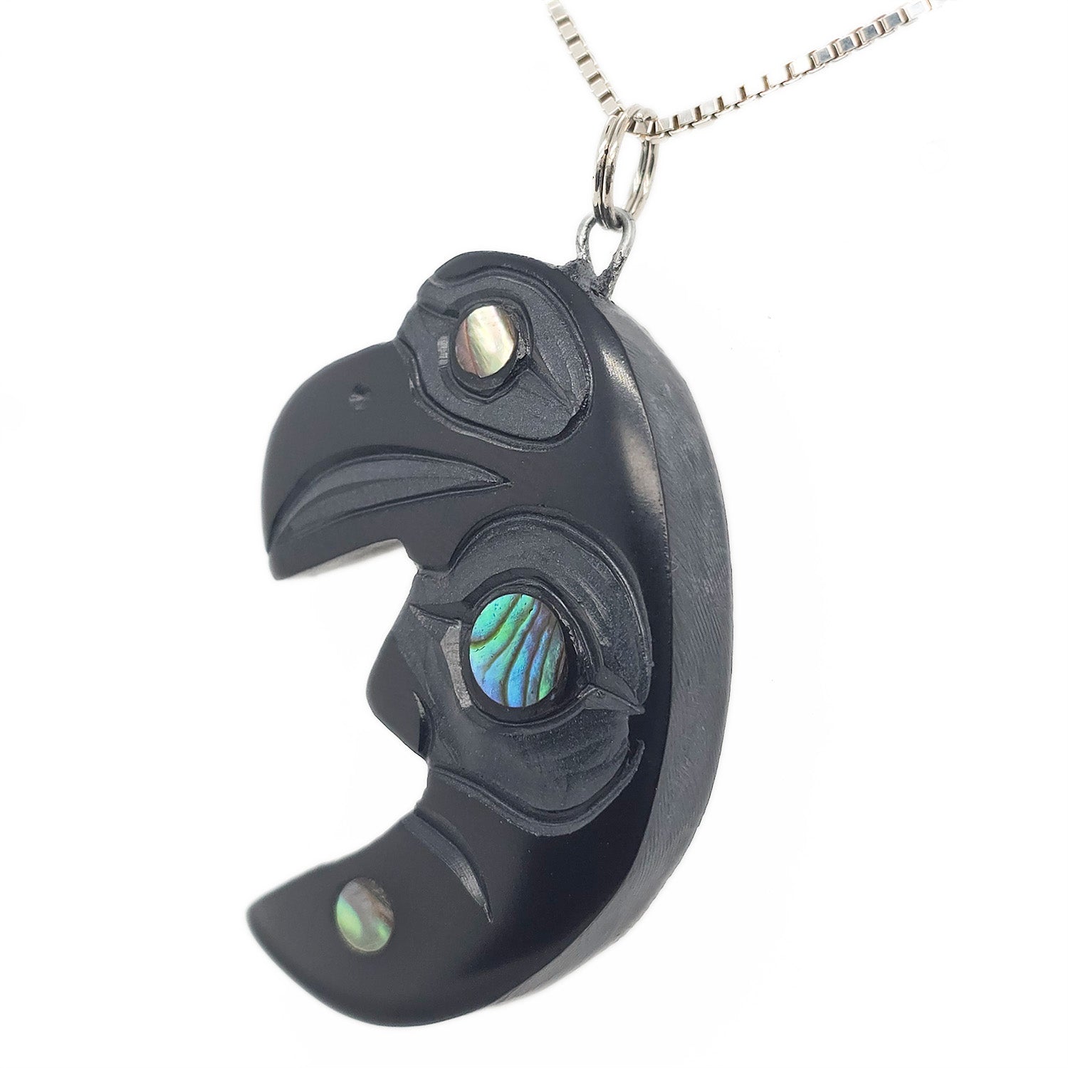 This Raven Moon Pendant has been hand-carved by Haida artist Amy Edgars. The Pendant features a carved crescent moon with a Raven carved into the top. It has been carved in argillite and features 3 abalone inlays.