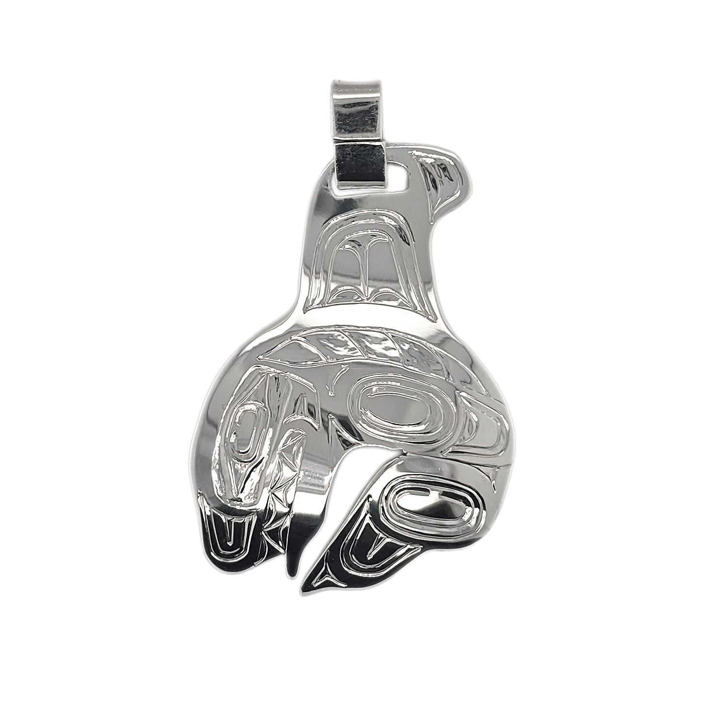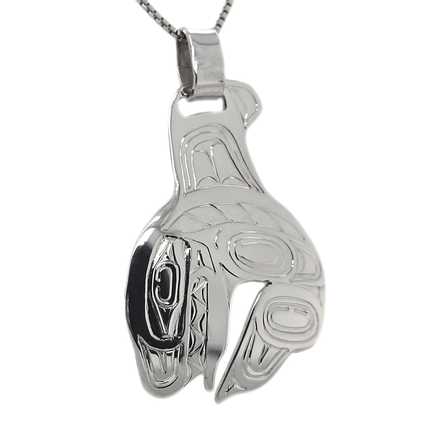 This Orca Pendant is hand-carved in sterling silver and signed by Haida artist Garner Moody.