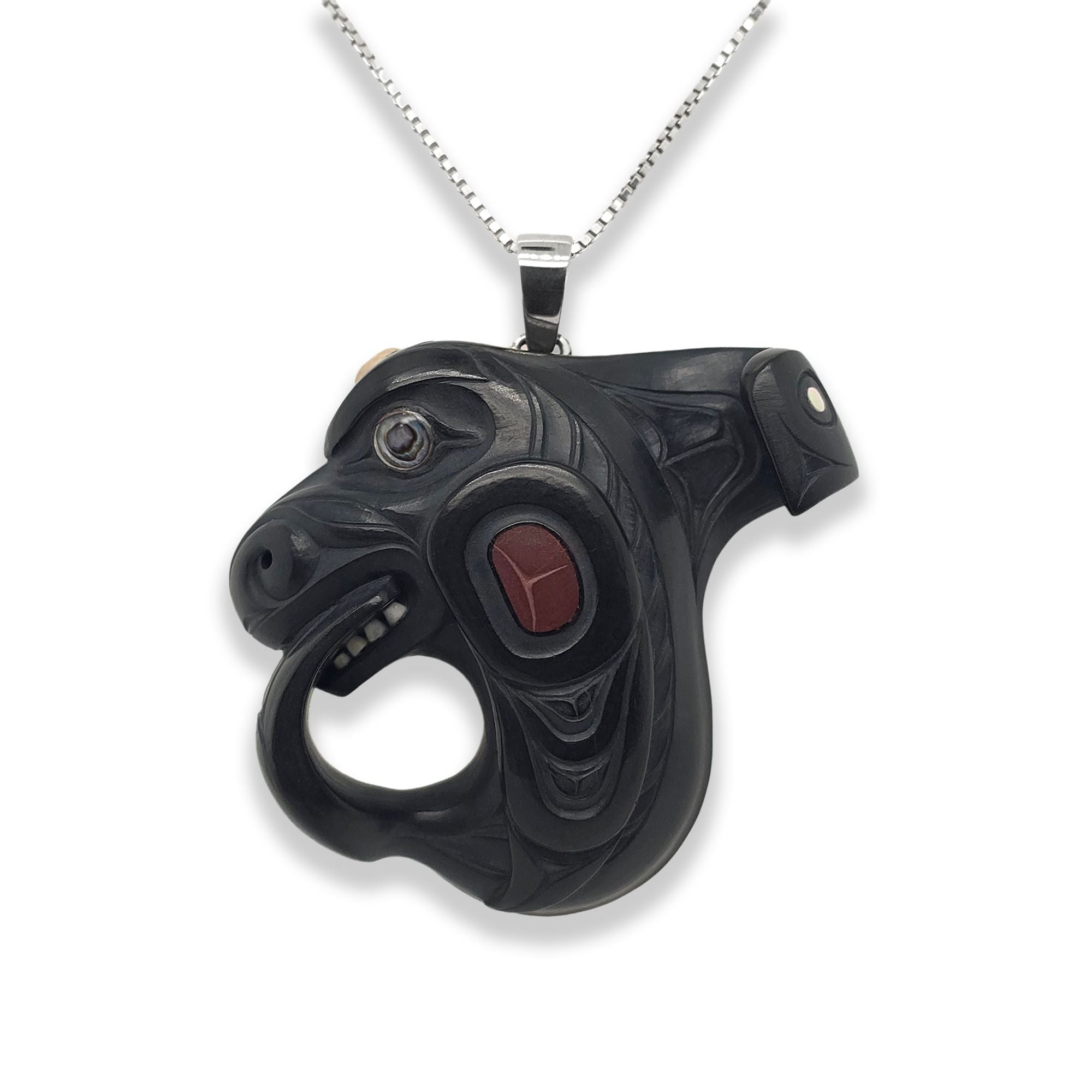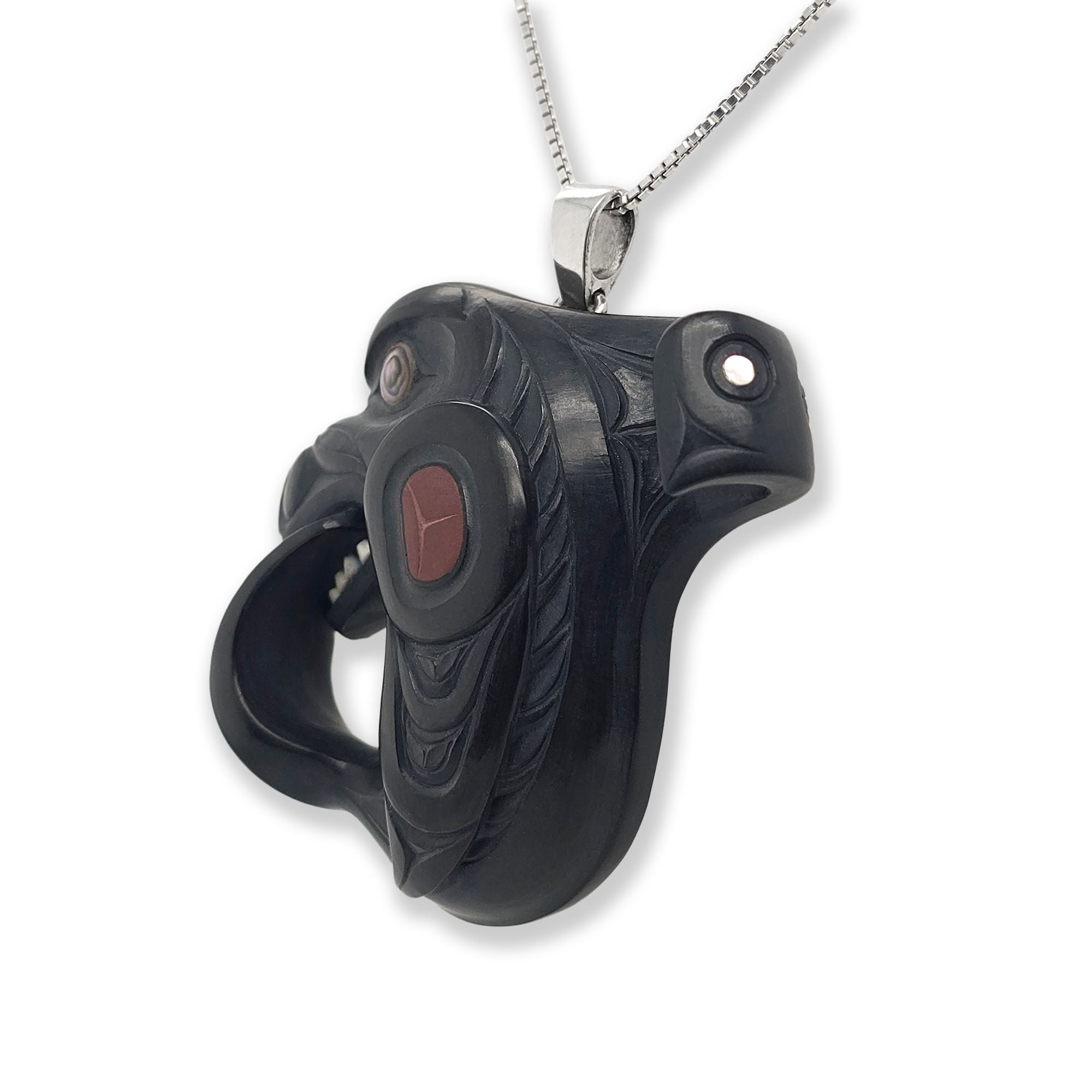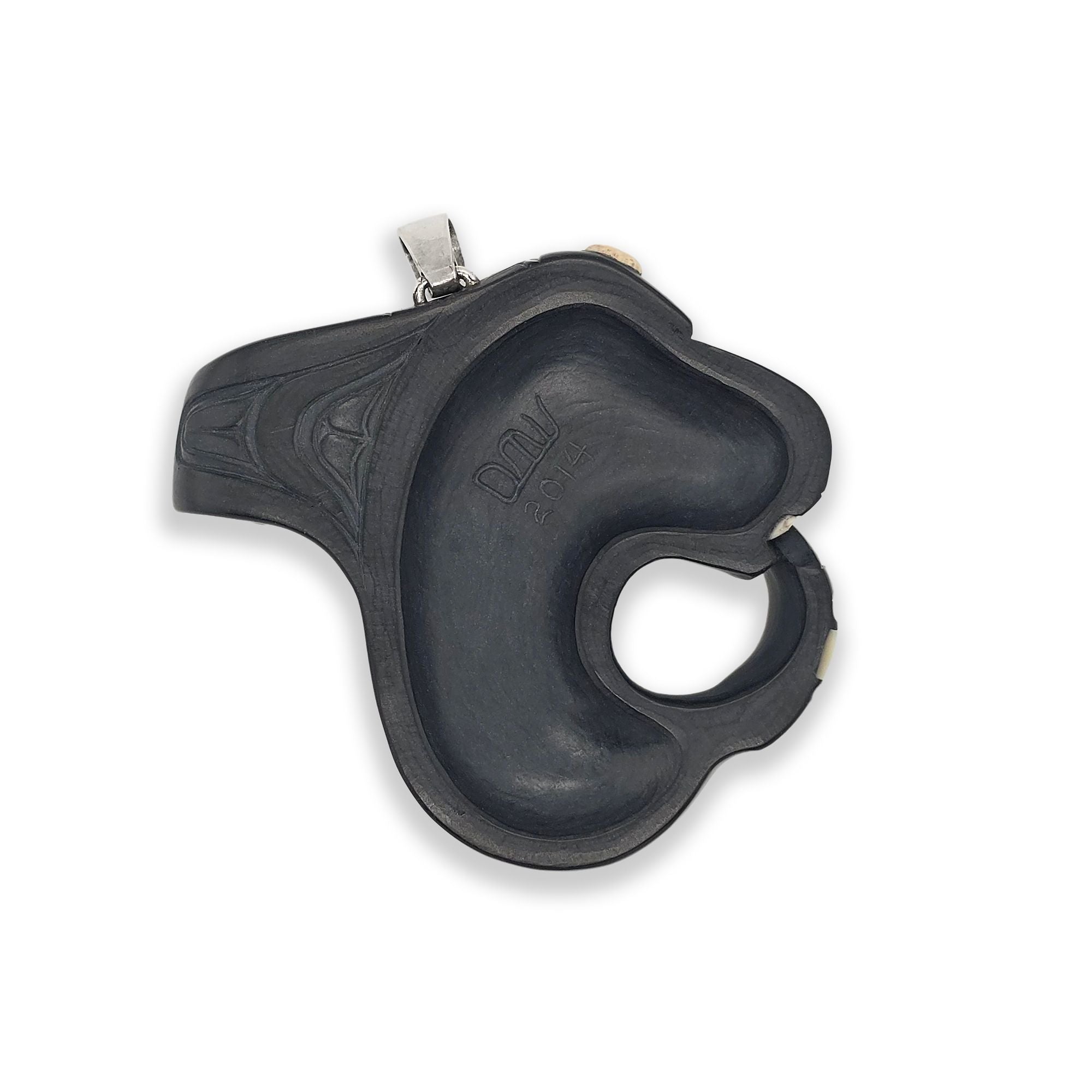 This Orca pendant was hand-carved in argillite by Haida artist Darrell White. It is adorned with 3 abalone inlays, a catlinite inlay, ivory teeth, and an ivory blowhole. This pendant was acquired from a collection and is in good condition.