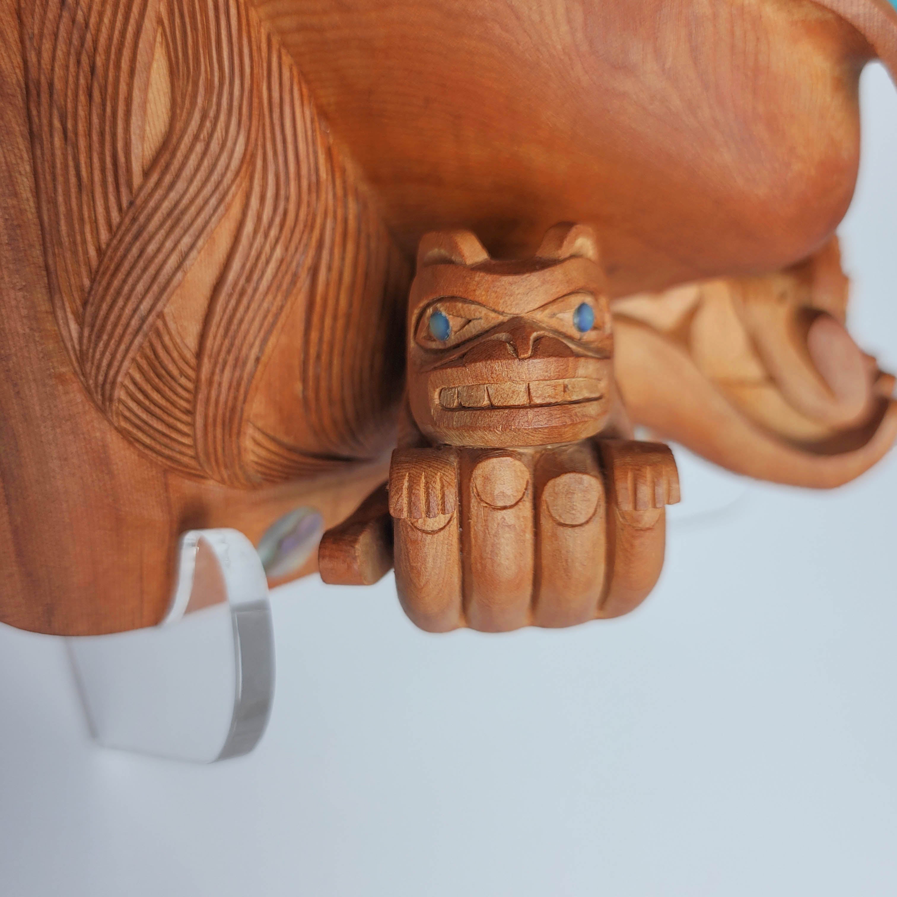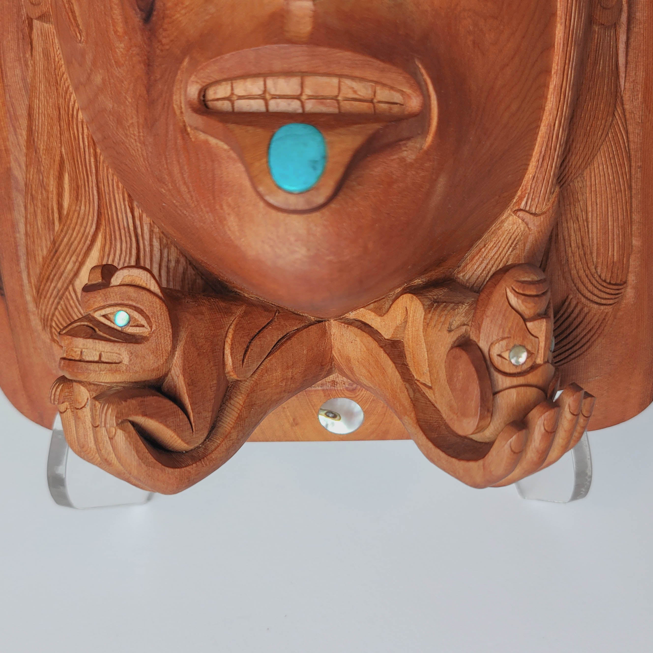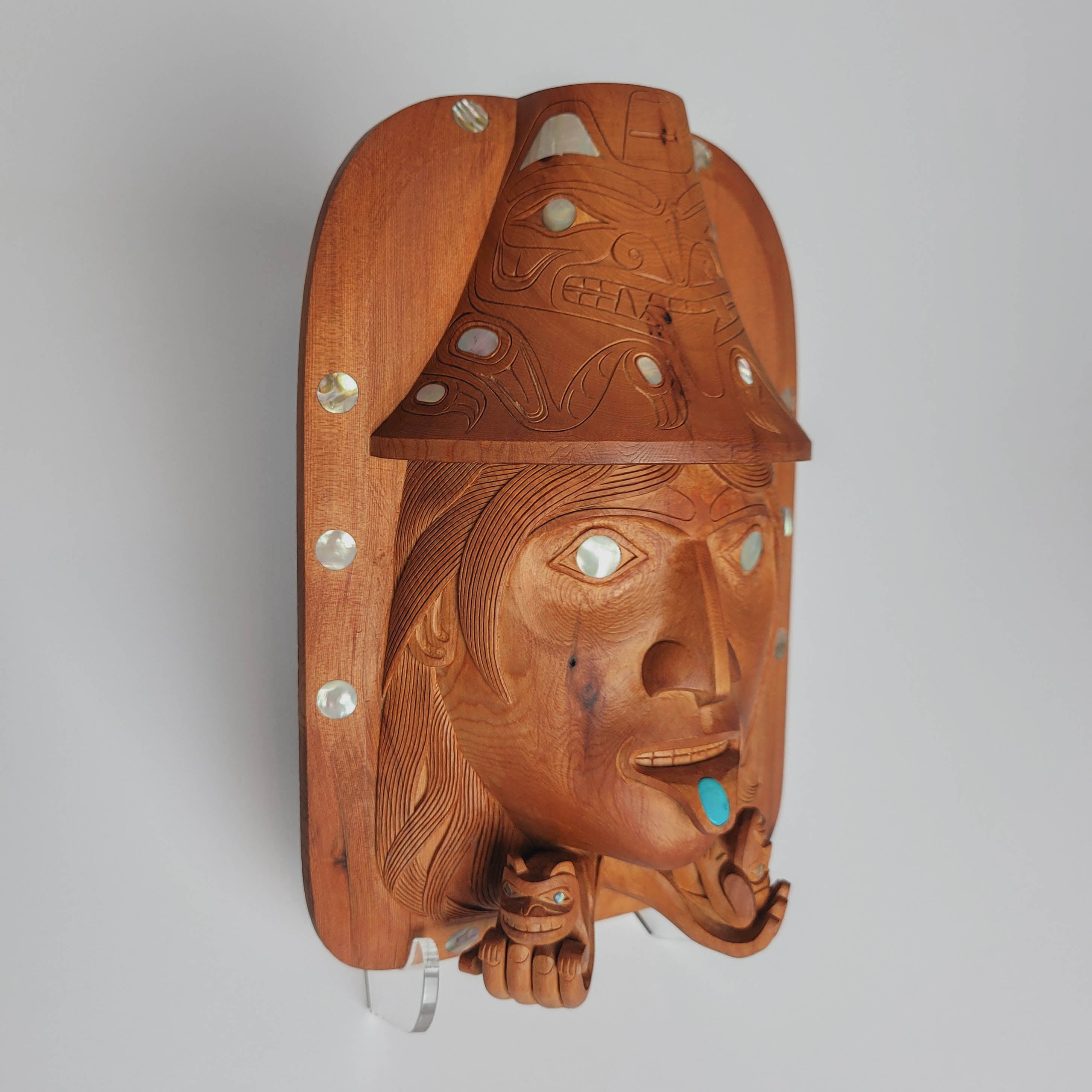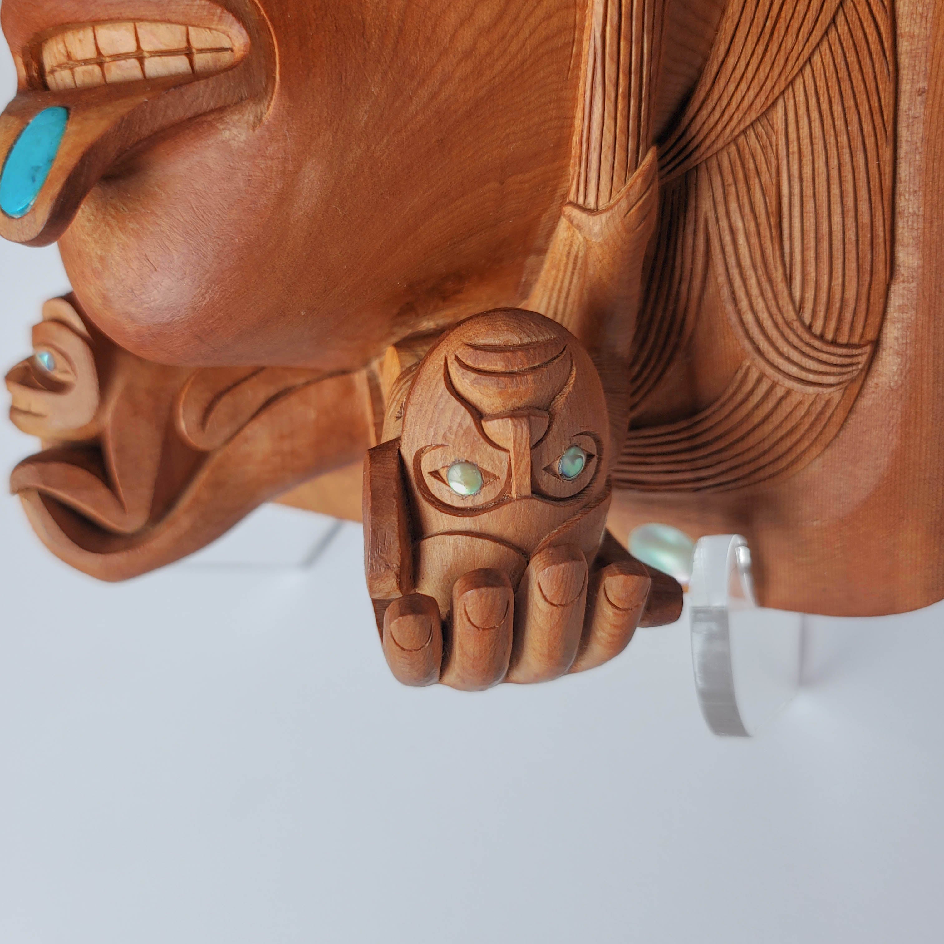 "The Haida Legend of Bear Mother" is an amazing piece hand-carved by Haida artist Ron Russ. It has been carved from yew wood and adorned with 27 inlays of abalone and mother of pearl throughout the piece and one inlay of turquoise symbolizing a labret in the lower lip.