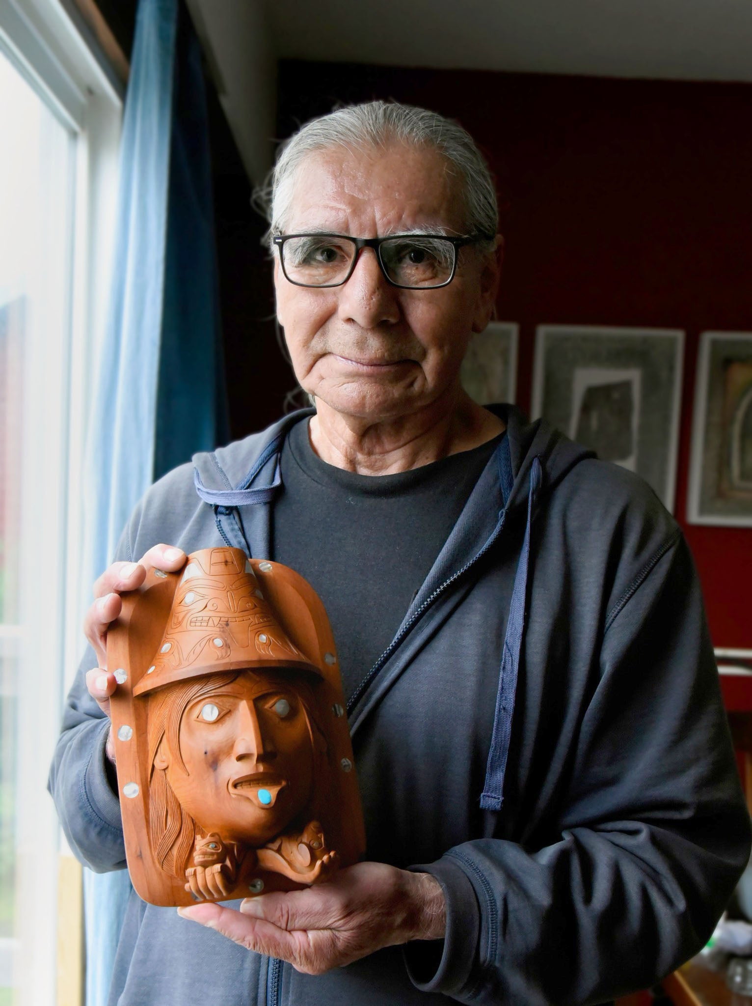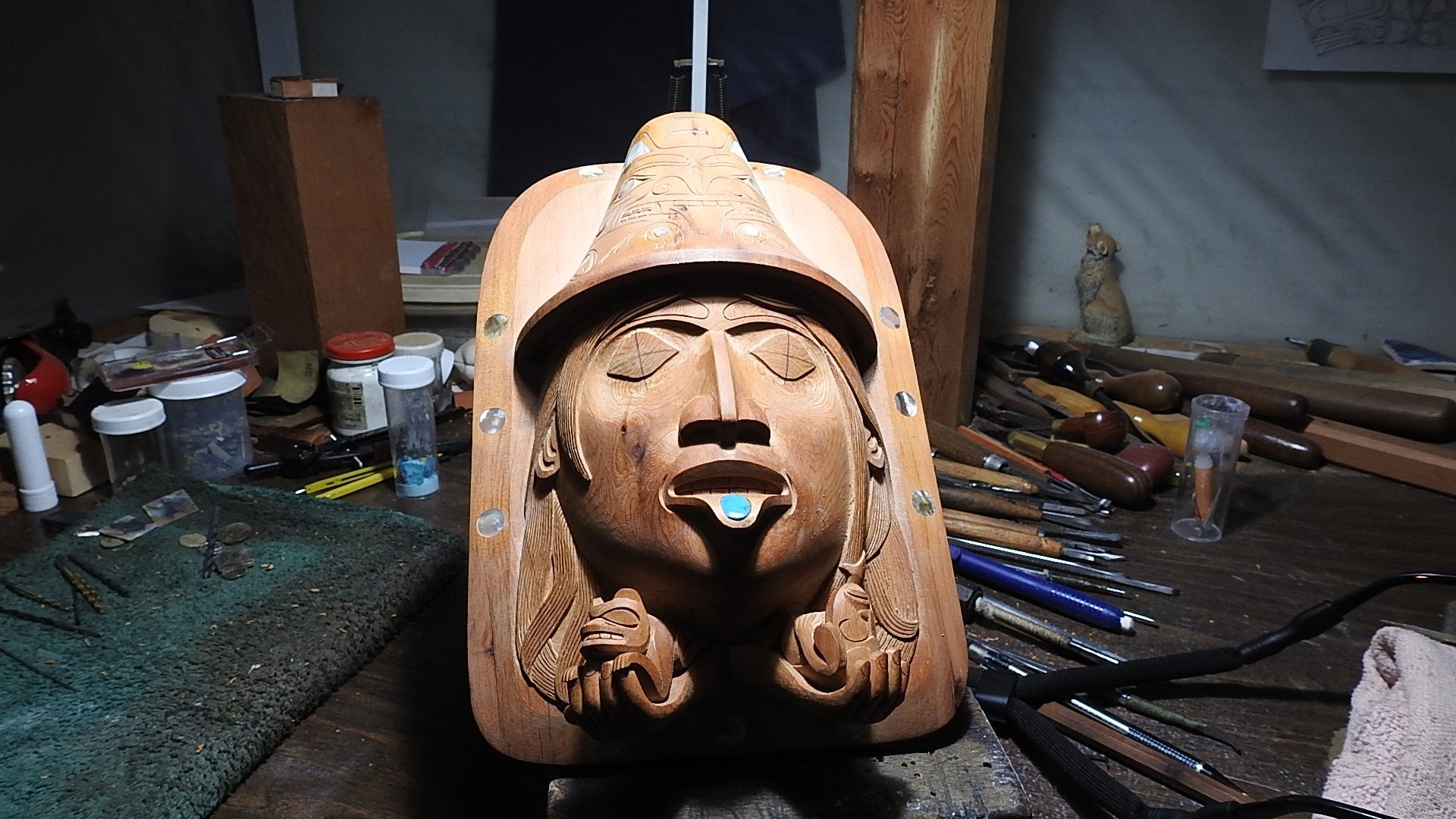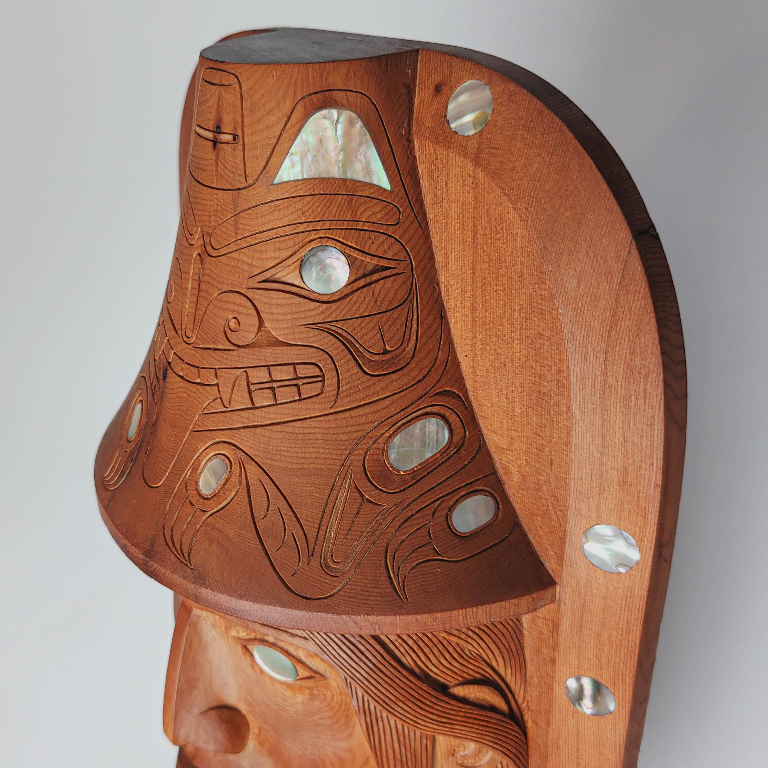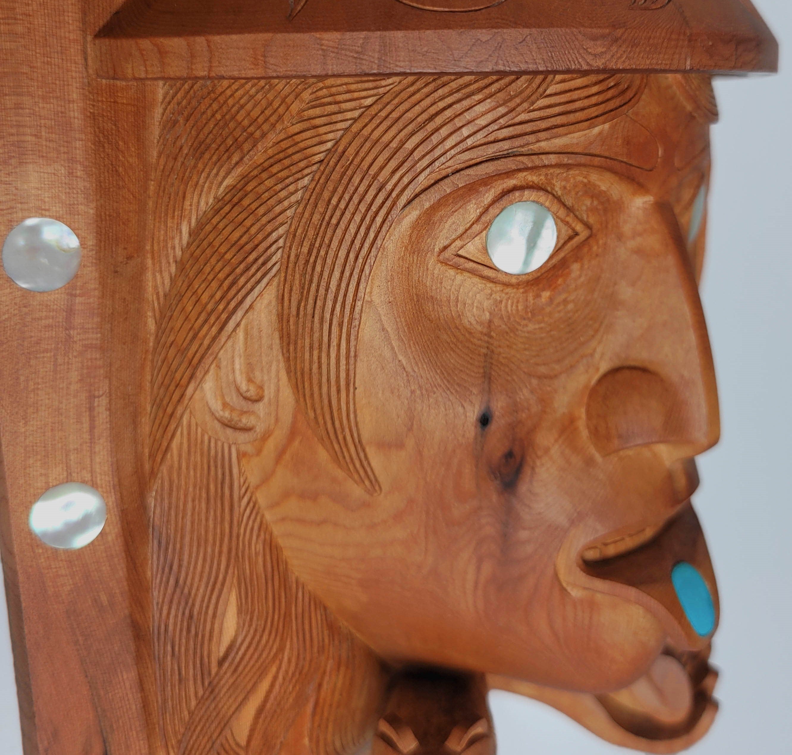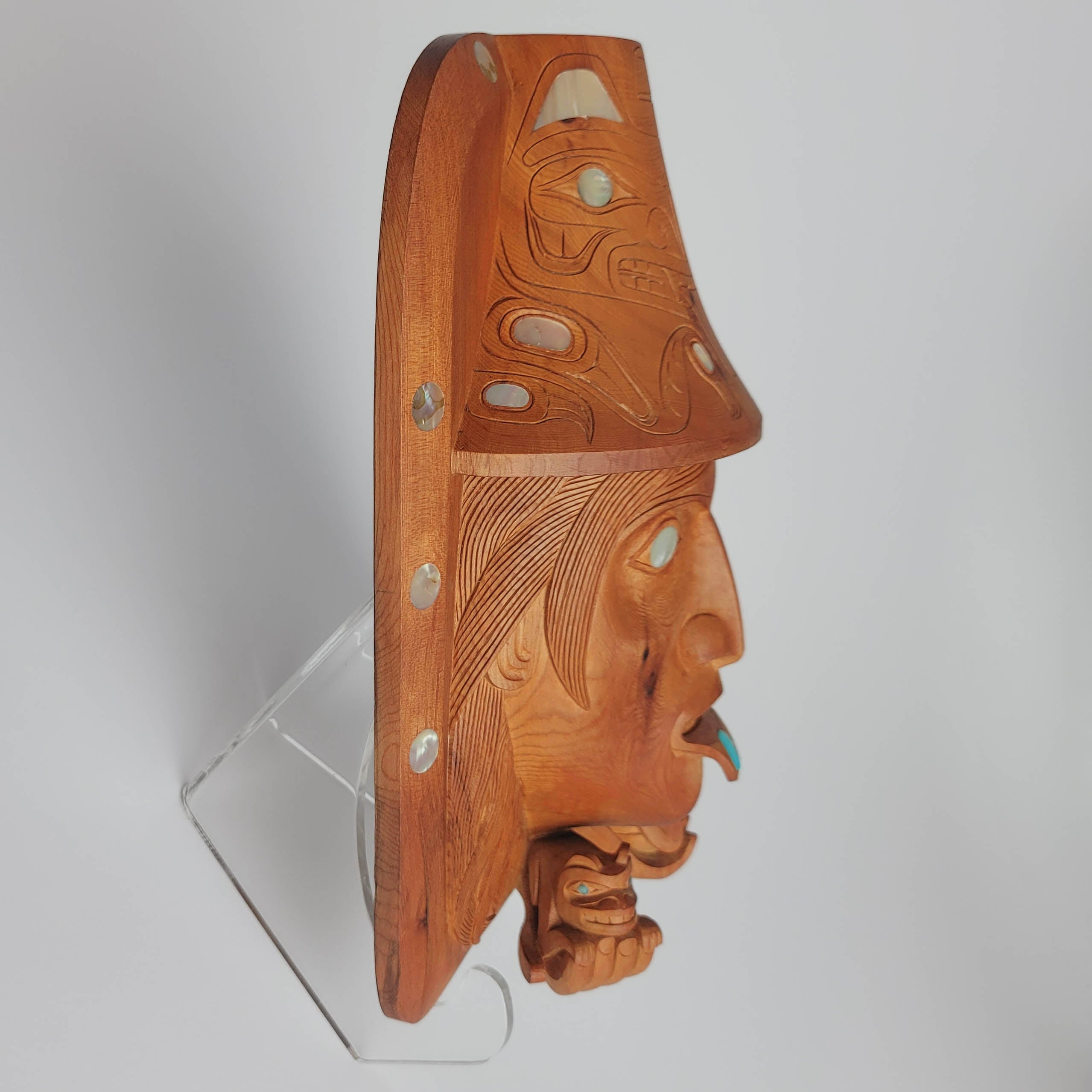 "The Haida Legend of Bear Mother" is an amazing piece hand-carved by Haida artist Ron Russ. It has been carved from yew wood and adorned with 27 inlays of abalone and mother of pearl throughout the piece and one inlay of turquoise symbolizing a labret in the lower lip.