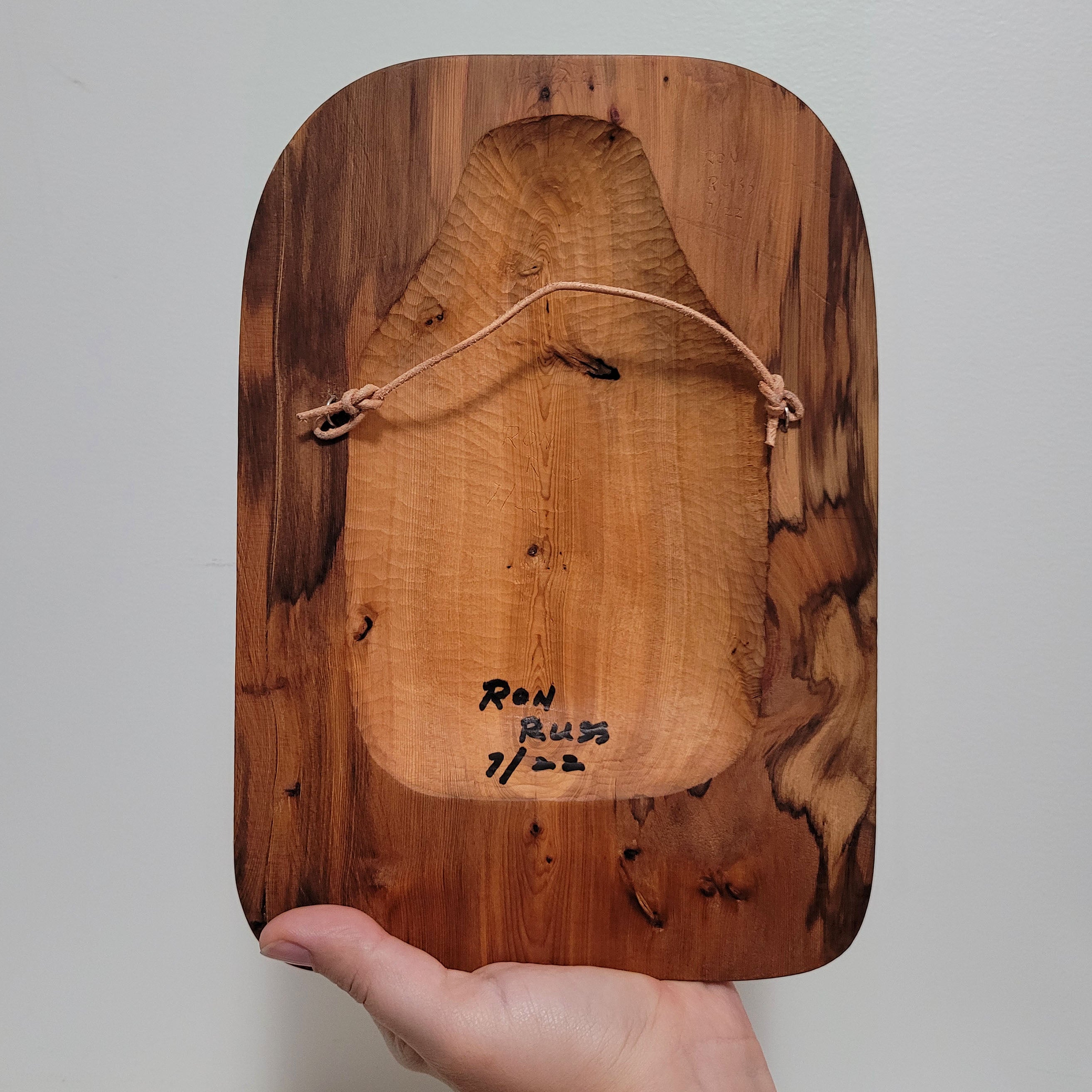 The second last image is of Ron Russ holding the carving. It was taken by Peter Sloan. The last image features an in progress view in Ron's workshop. It was taken by Richard Wilson.