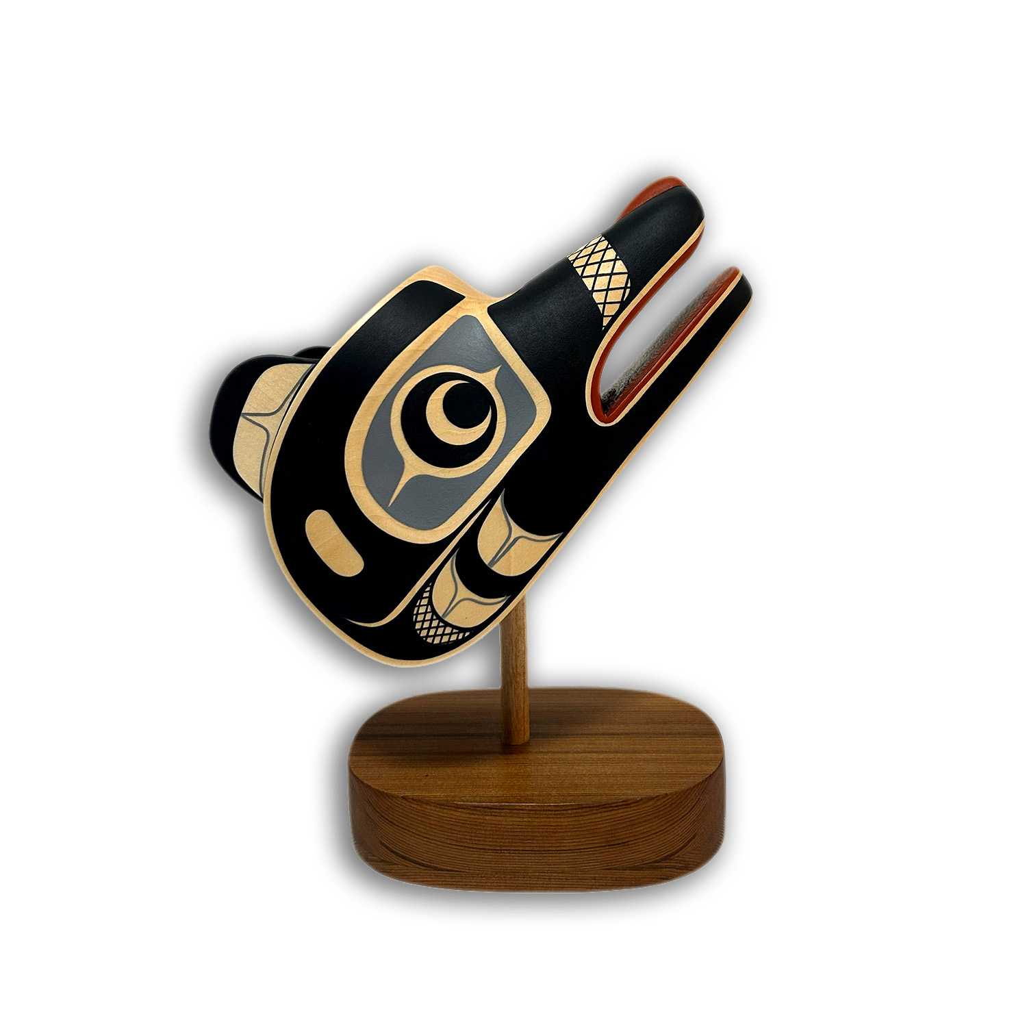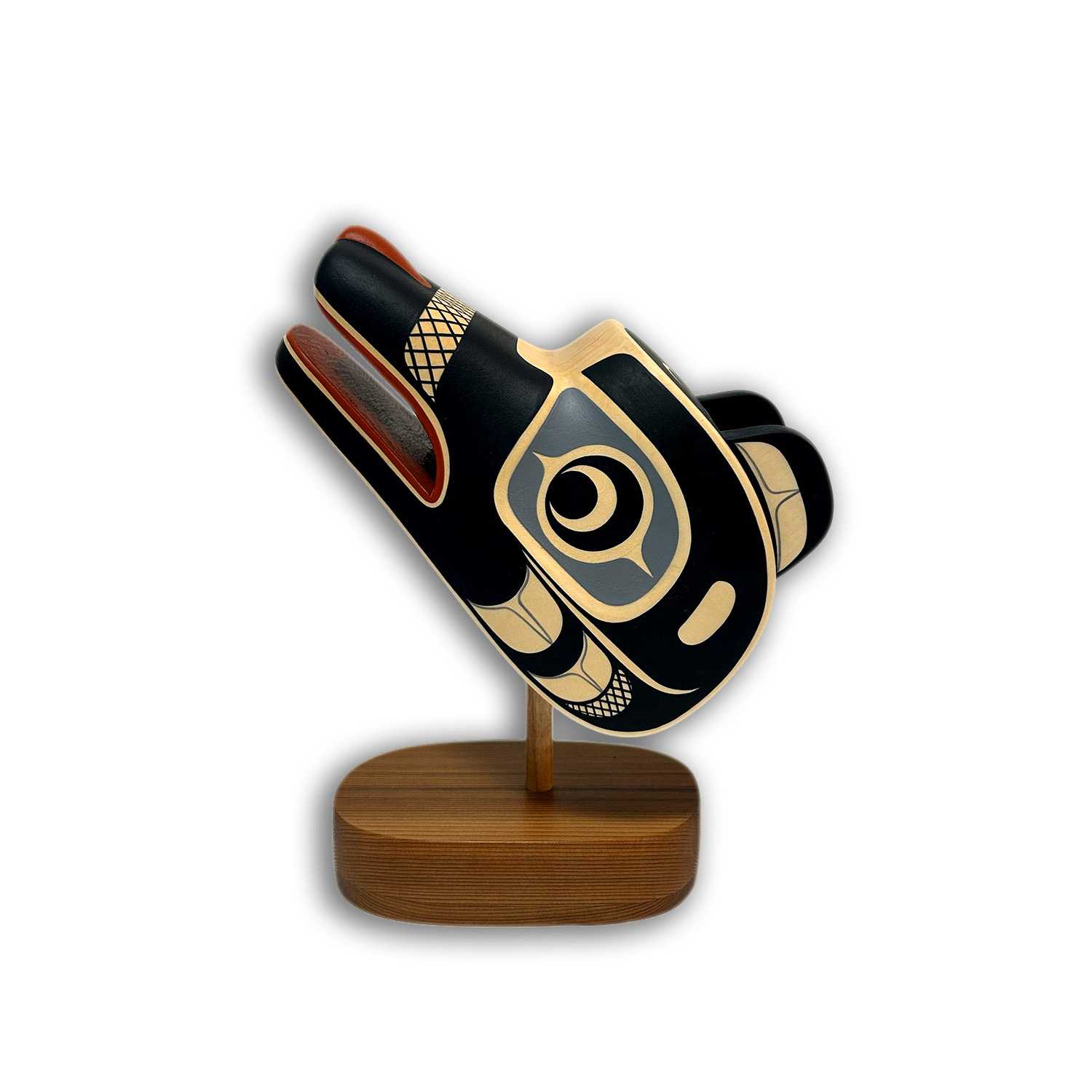 This Wolf Maskette was hand-carved and painted by Kwakwaka'wakw artist Rod Smith. It had been carved from basswood, sits on a removable red cedar base, and has been painted in acrylic. Rod is perhaps best known for his precise and elegant painting style.