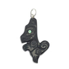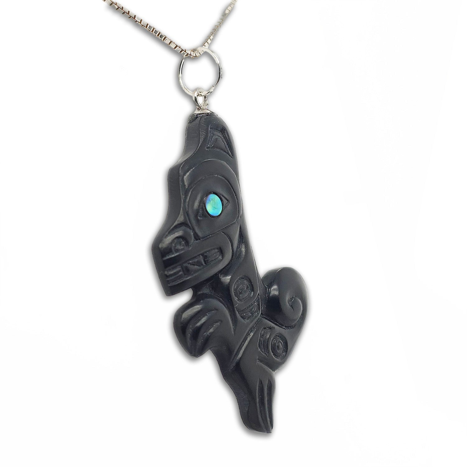 This Wolf Pendant is hand-carved in argillite by Haida artist Gryn White. It features one inlay of abalone in the eye.