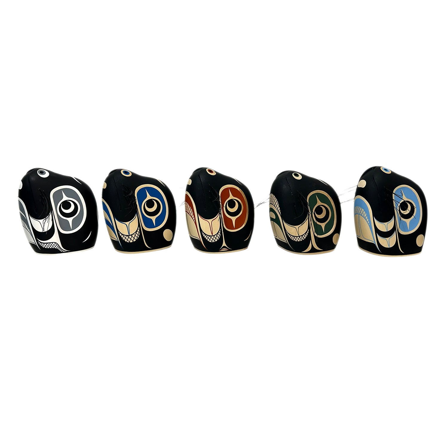 This Seal Head Sculpture was hand-carved and painted by Kwakwaka'wakw artist Rod Smith. Each seal head is carved from basswood, painted in acrylic, and features synthetic whiskers. Rod is perhaps best known for his precise and elegant painting style, which can be seen on this sculpture.
