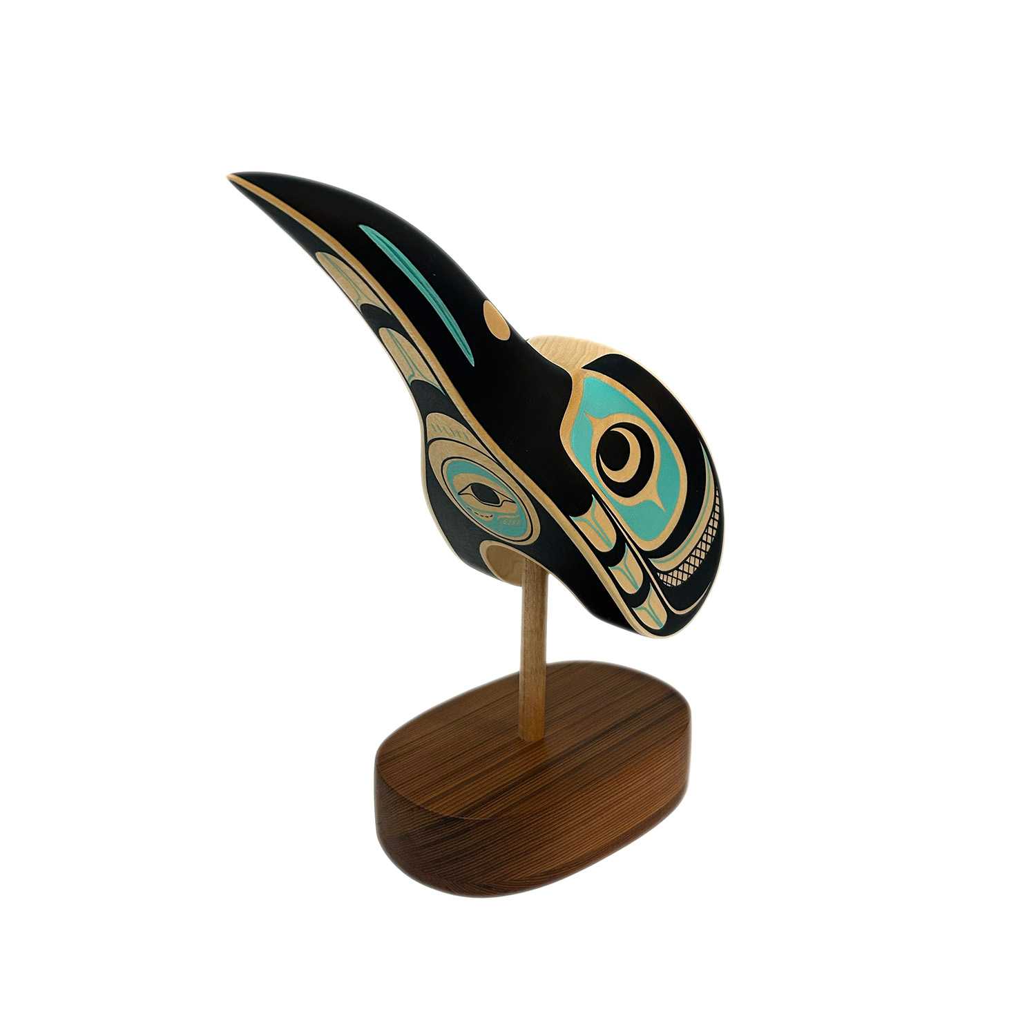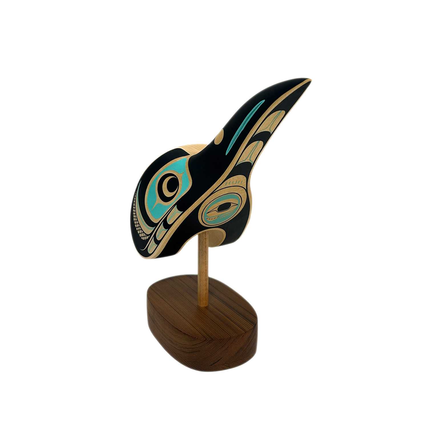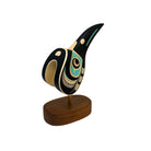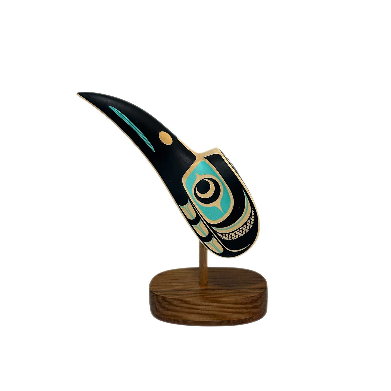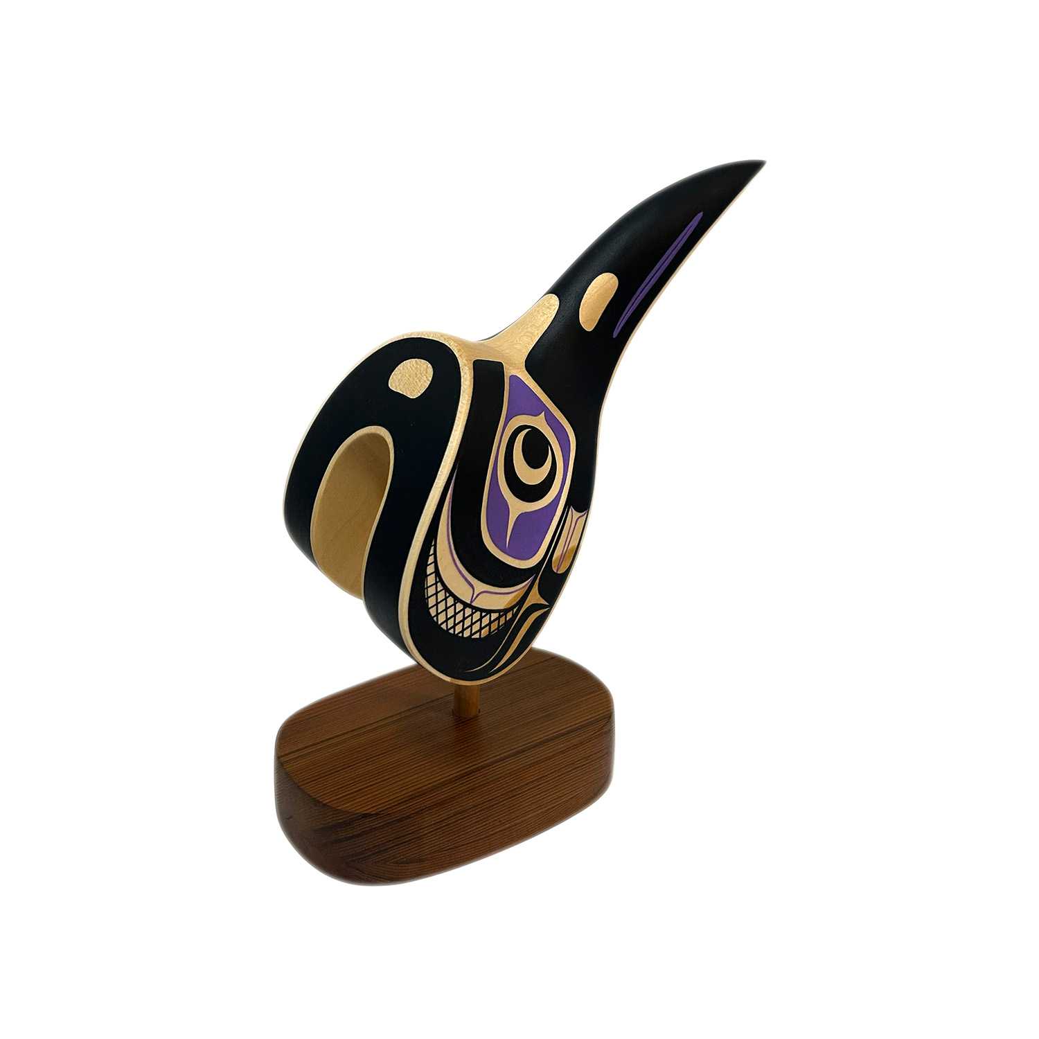 These Hummingbird Maskettes are each uniquely hand-carved and painted by Kwakwaka'wakw artist Rod Smith. They have been carved from basswood, sit on a removable red cedar base, and have been painted in acrylic. Rod is perhaps best known for his precise and elegant painting style.