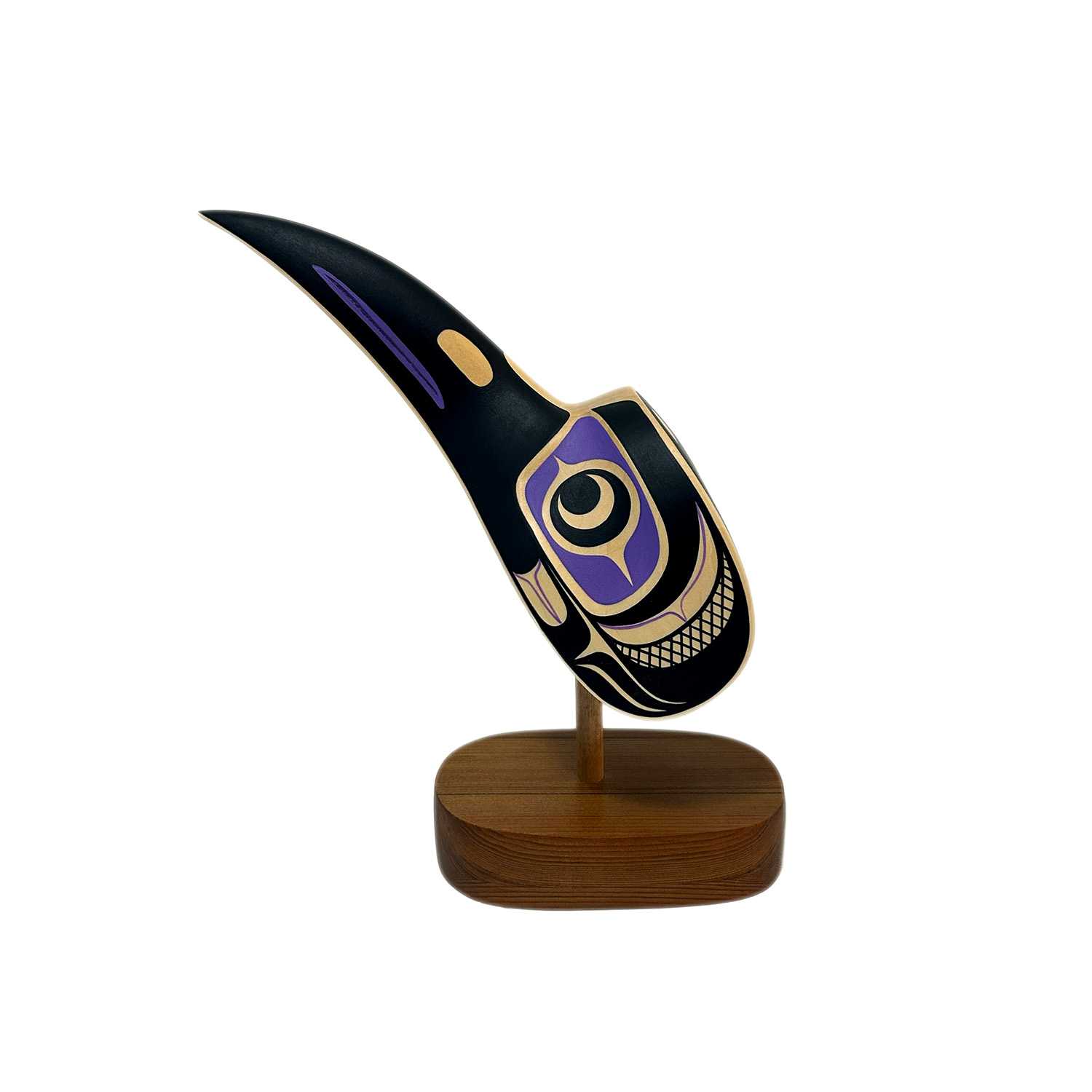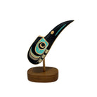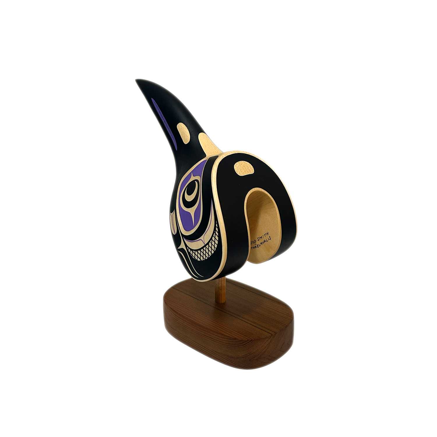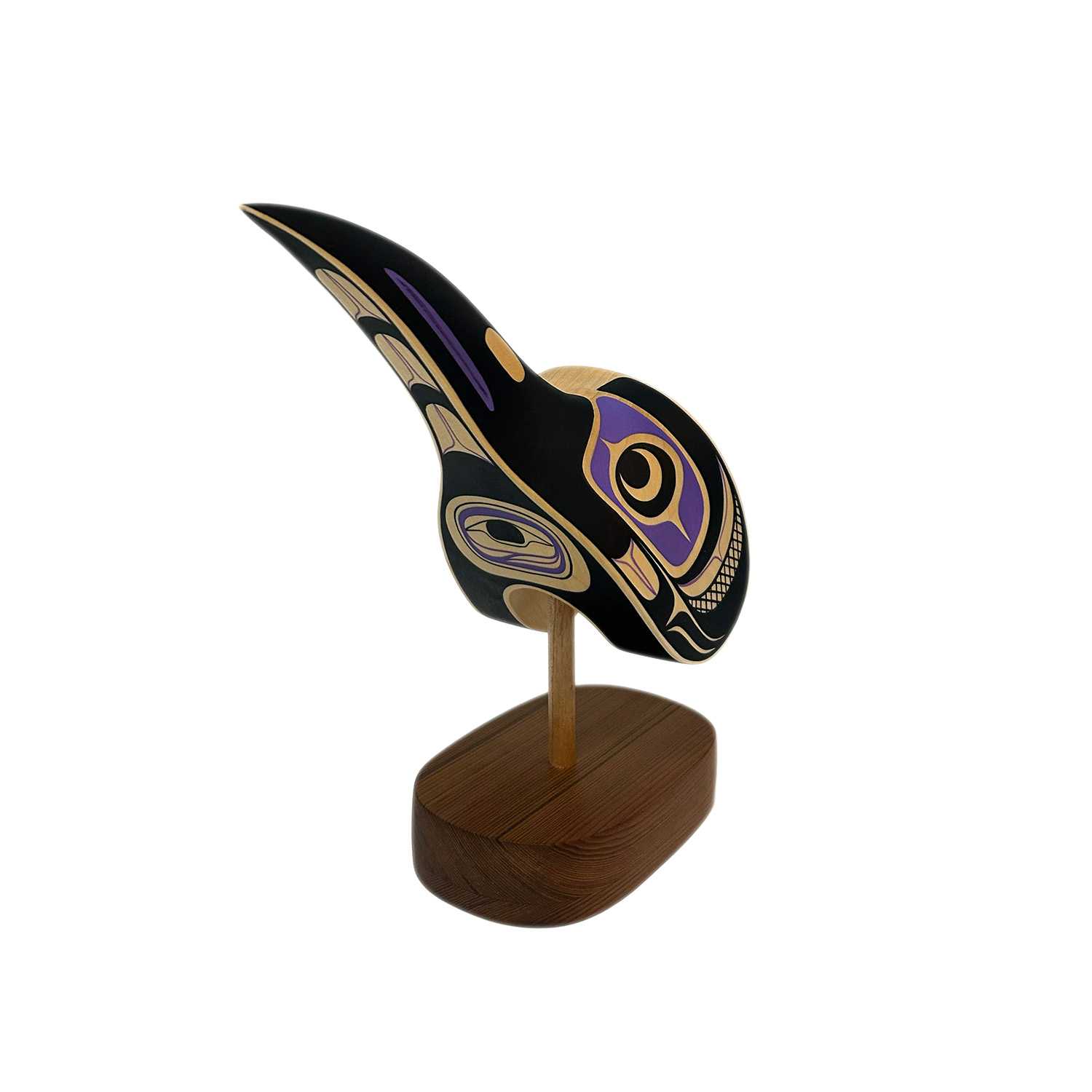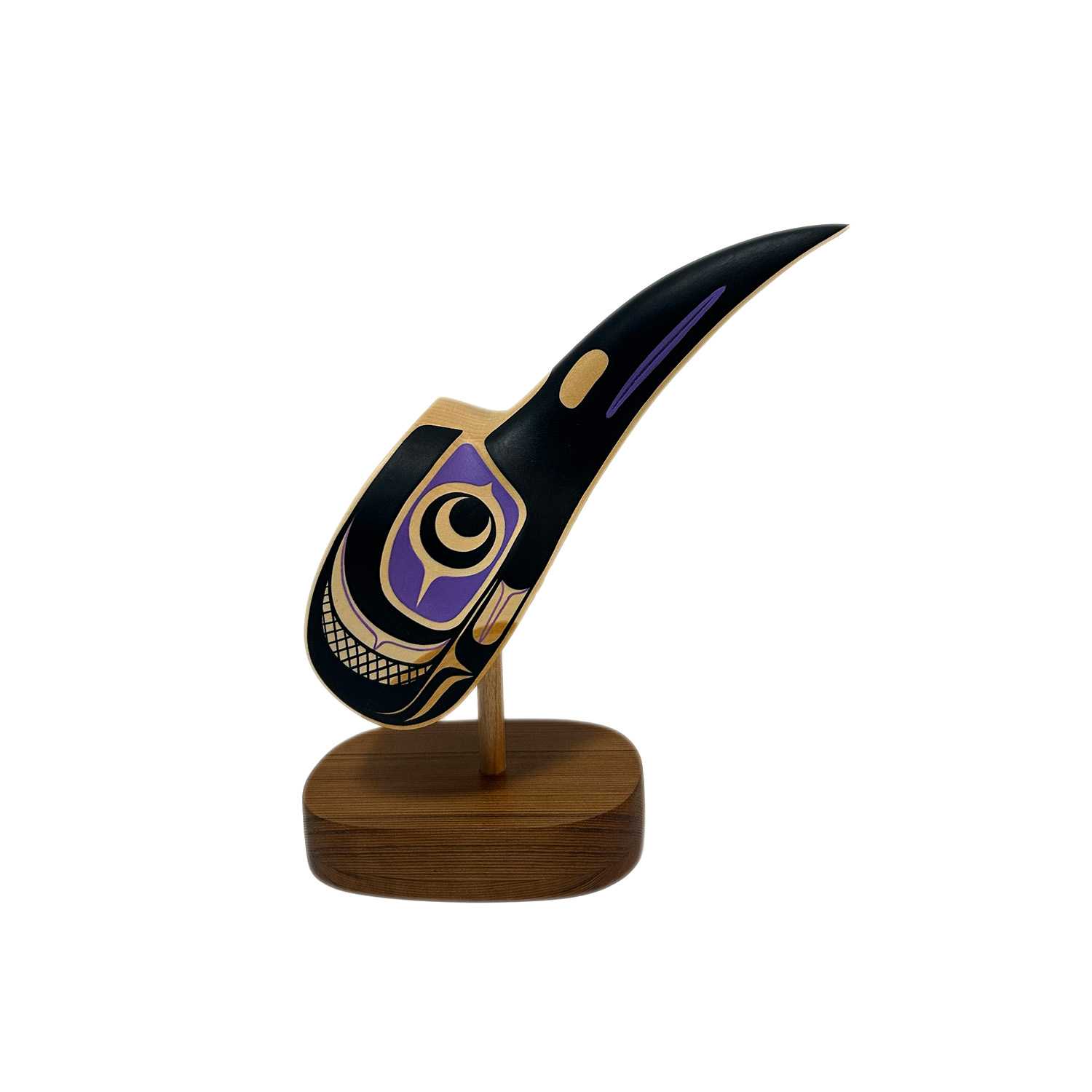 These Hummingbird Maskettes are each uniquely hand-carved and painted by Kwakwaka'wakw artist Rod Smith. They have been carved from basswood, sit on a removable red cedar base, and have been painted in acrylic. Rod is perhaps best known for his precise and elegant painting style.