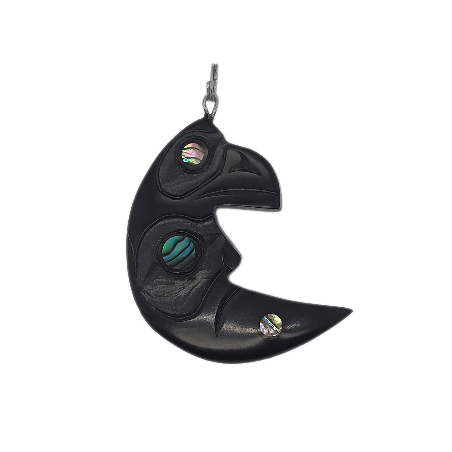 This Raven Moon Pendant has been hand-carved by Haida artist Amy Edgars. The Pendant features a carved crescent moon with a Raven carved into the top. It has been carved in argillite and features 3 abalone inlays.