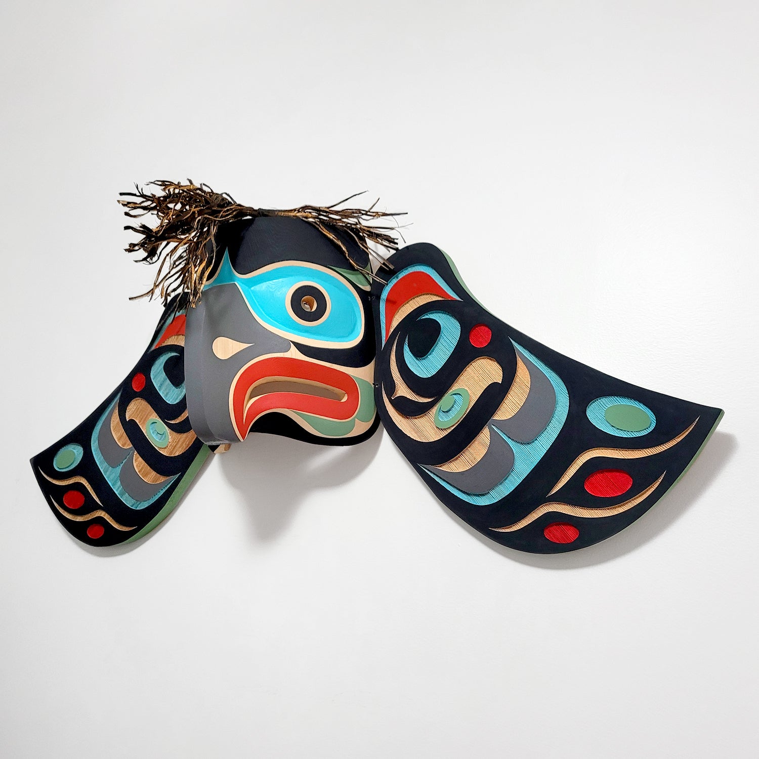 This beautiful Eagle Mask is hand-carved and sandblasted by Kwakiutl artist Trevor Hunt. The mask was created from red cedar, painted in black, red, turquoise, sage green, and gray acrylic, and accented with cedar bark.