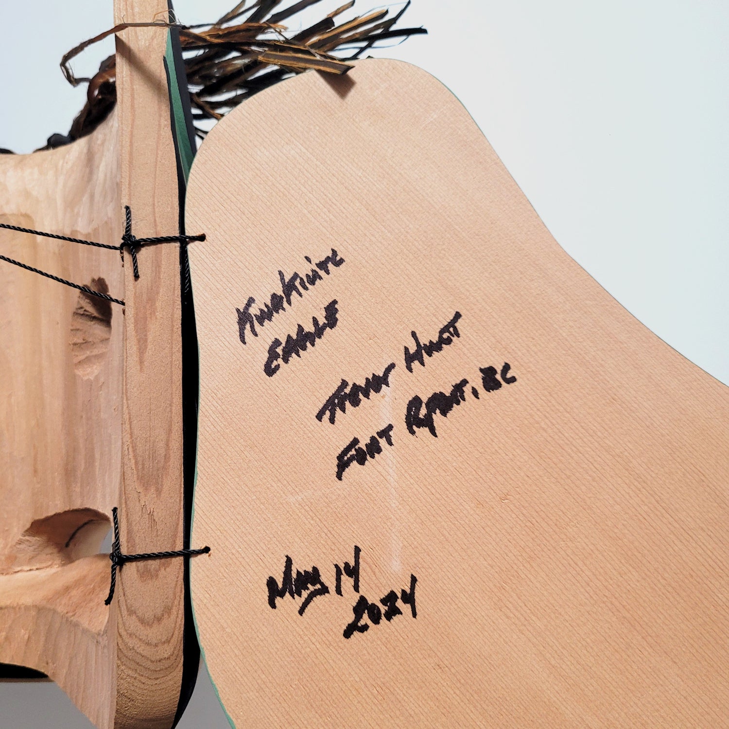The head of the Eagle has been hand-carved, while the wings of the eagle have been sandblasted. This reflects Trevor's skill at combining traditional Northwest Coast tools and techniques with modern methods and machinery.