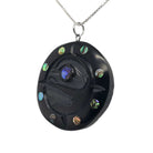 This Full Moon Pendant has been hand-carved by Haida artist Amy Edgars. The Pendant has been carved in argillite and features 9 abalone inlays.