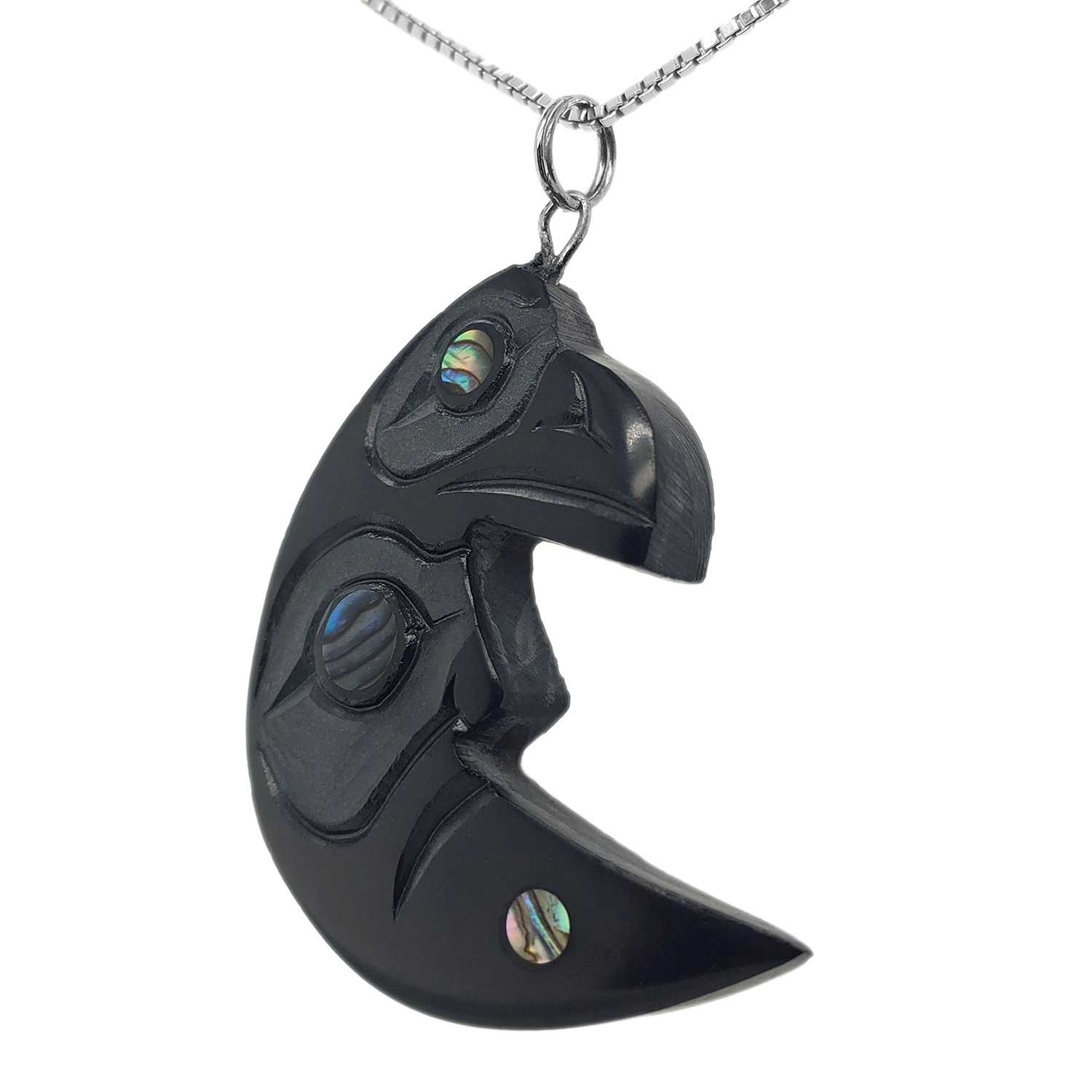 This Raven Moon Pendant has been hand-carved by Haida artist Amy Edgars. The Pendant features a carved crescent moon with a Raven carved into the top. It has been carved in argillite and features 3 abalone inlays.