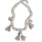 This Freshwater Pearl and Clamshell sterling silver necklace is made from freshwater pearls, both round and biwa pearls, with engraved formline design elements, salmon bones, pink quartz, morganite and shells cast in silver by Tsimshian artist Morgan Asoyuf.