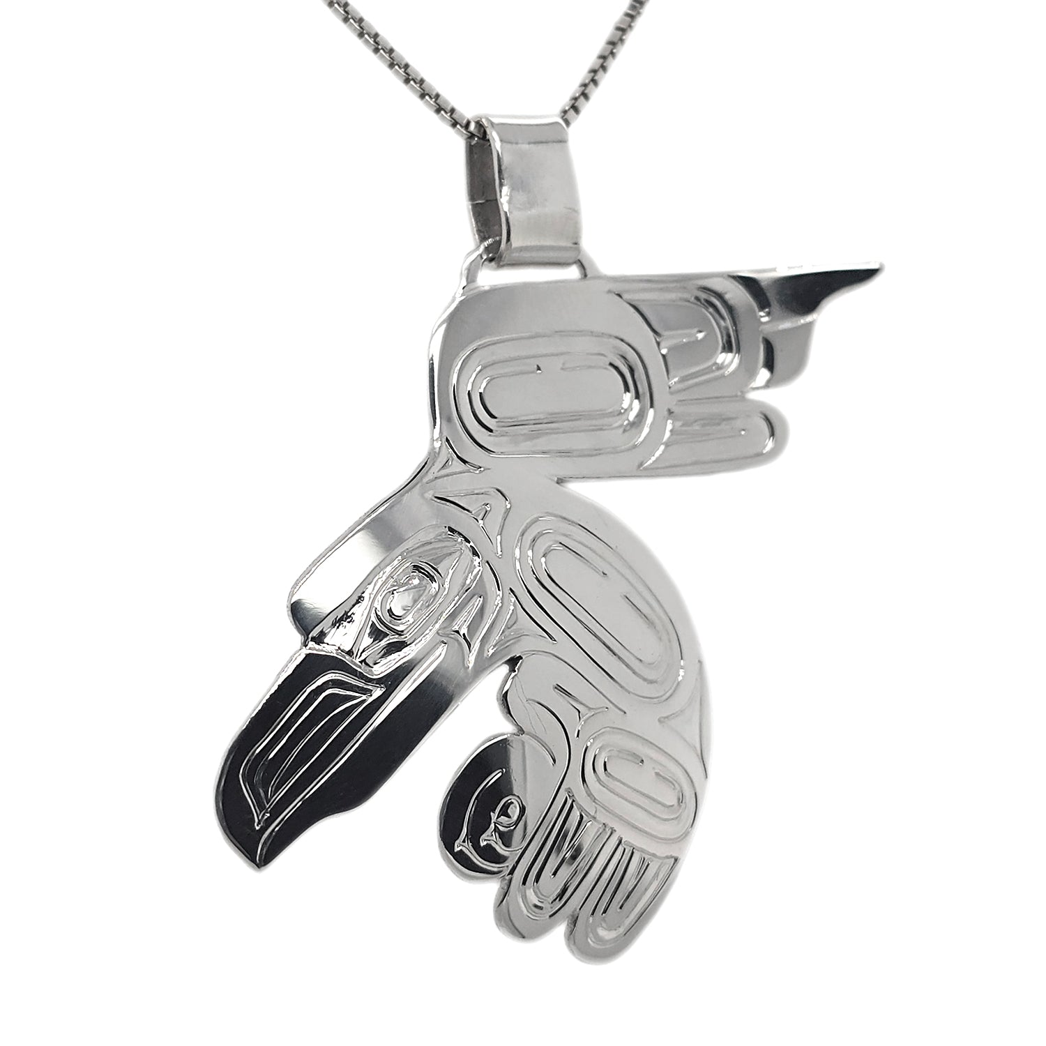 This Raven Pendant is hand-carved in sterling silver by Haida artist Garner Moody.