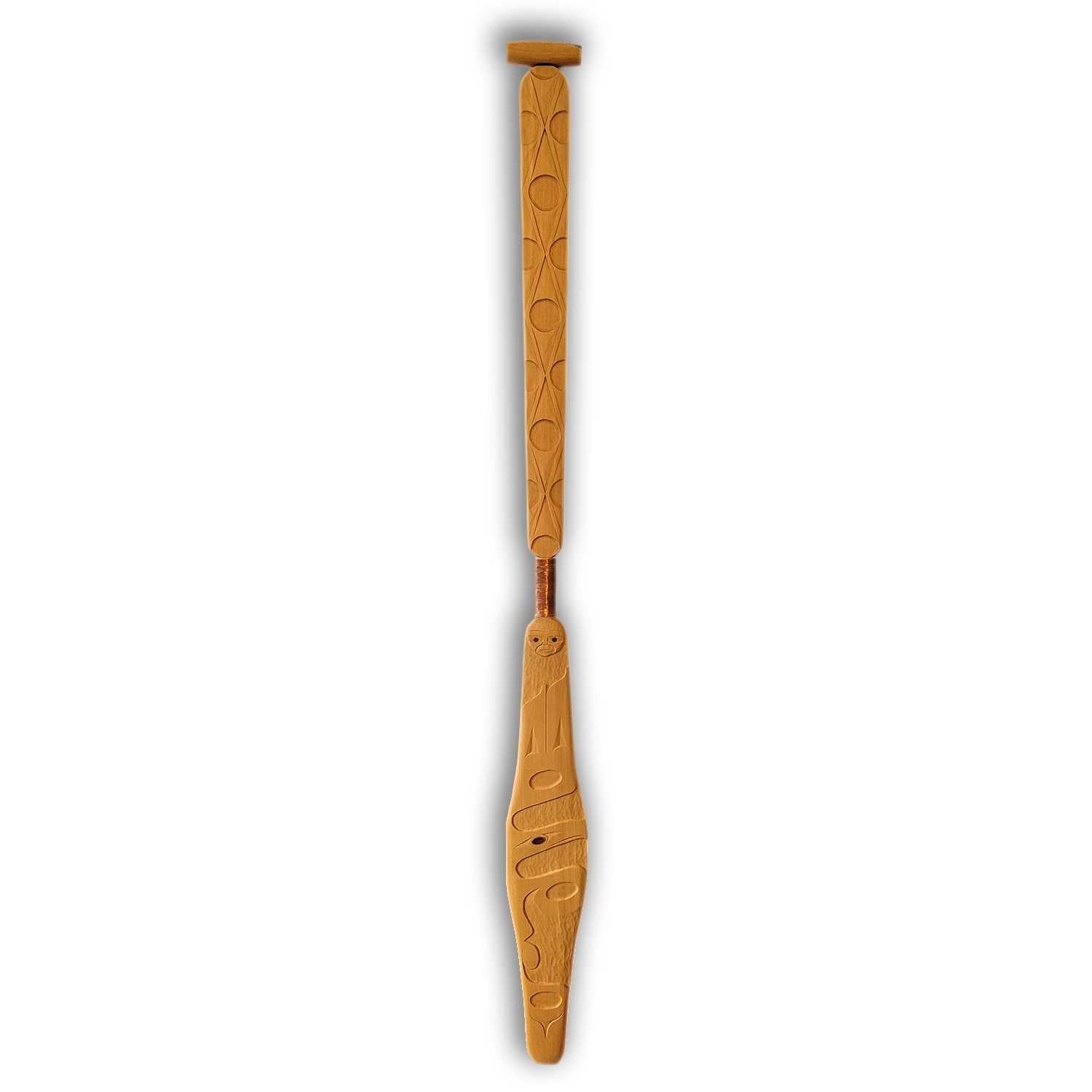 This Raven Caressing the Sun Paddle is hand-carved in yellow cedar by Coast Salish artist Jody Sparrow with copper sections in the Raven and Sun's eyes. The Paddle features Jody's signature carving style, representing a Raven at the bottom of the paddle and Sun towards the middle of the paddle.