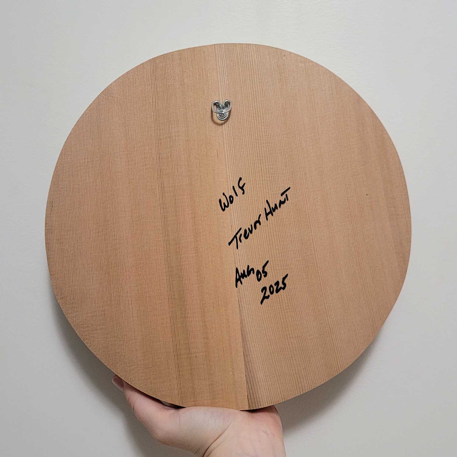 The red cedar panel is about 11 3/4 inches or 30 centimeters in diameter and 1 1/2 inches or 4 centimeters thick.