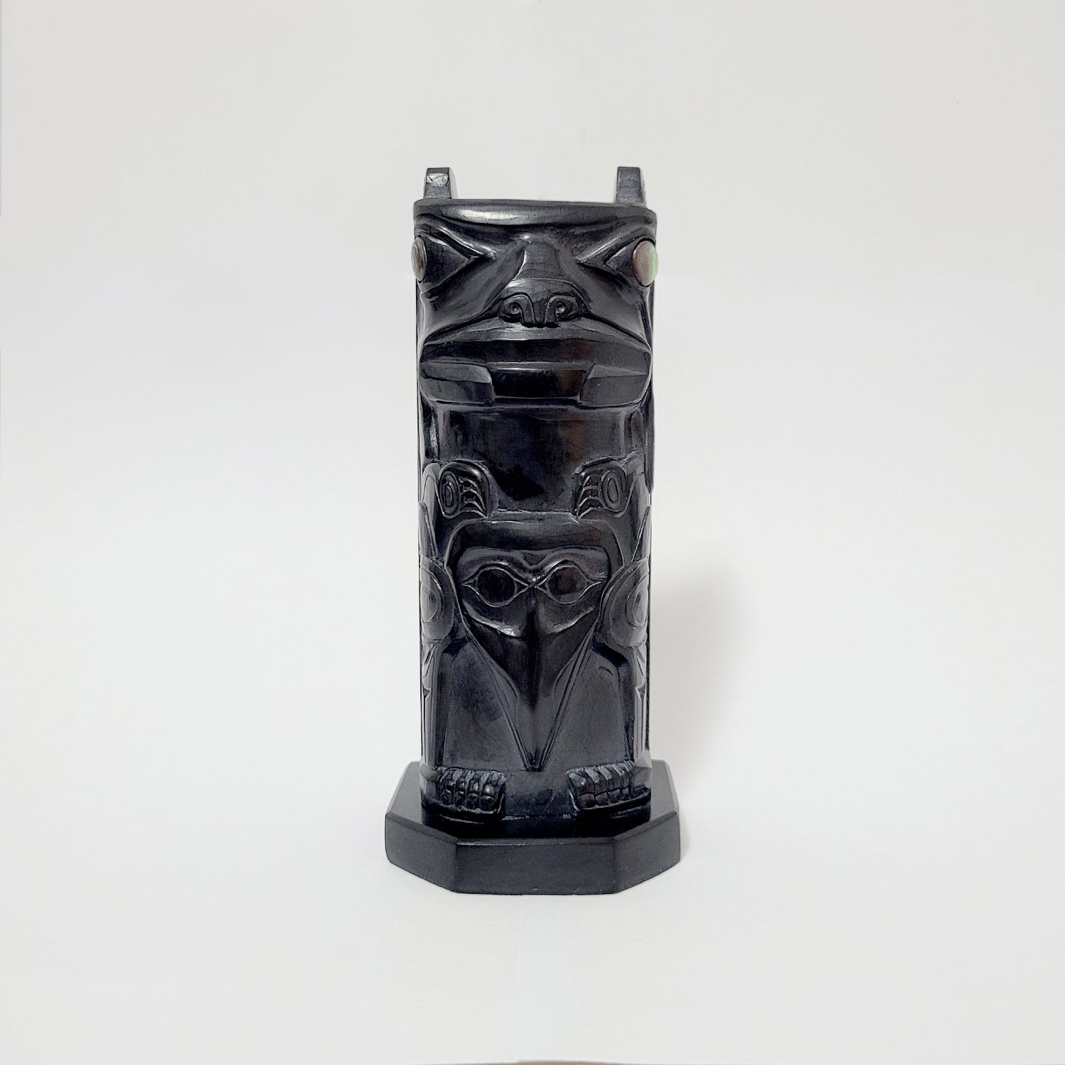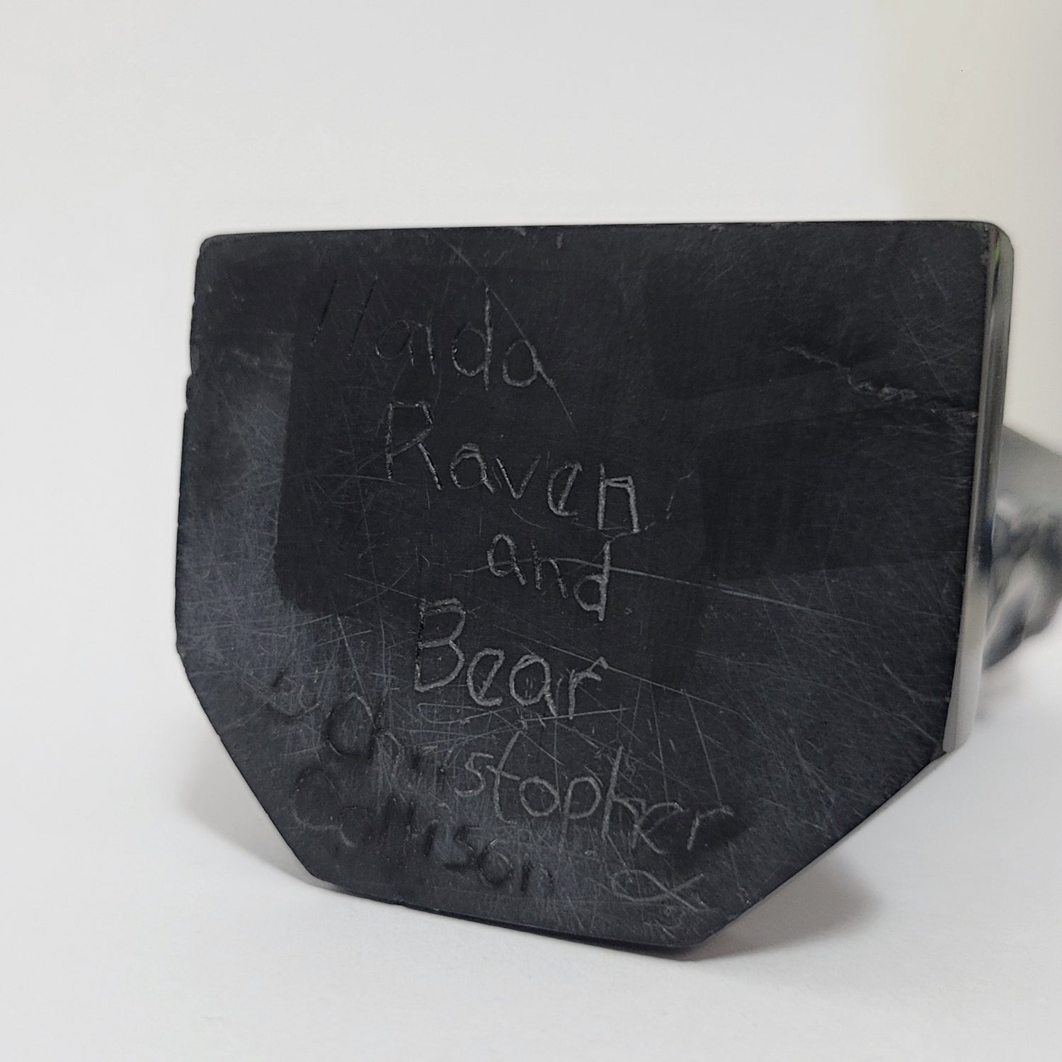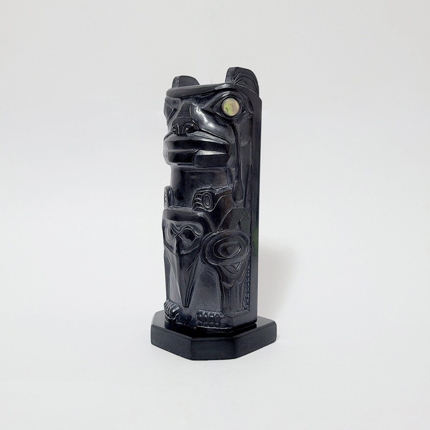 This Bear & Raven Totem Pole is hand-carved and signed by Haida artist Christopher Collison. It is carved in argillite and features two abalone inlays.