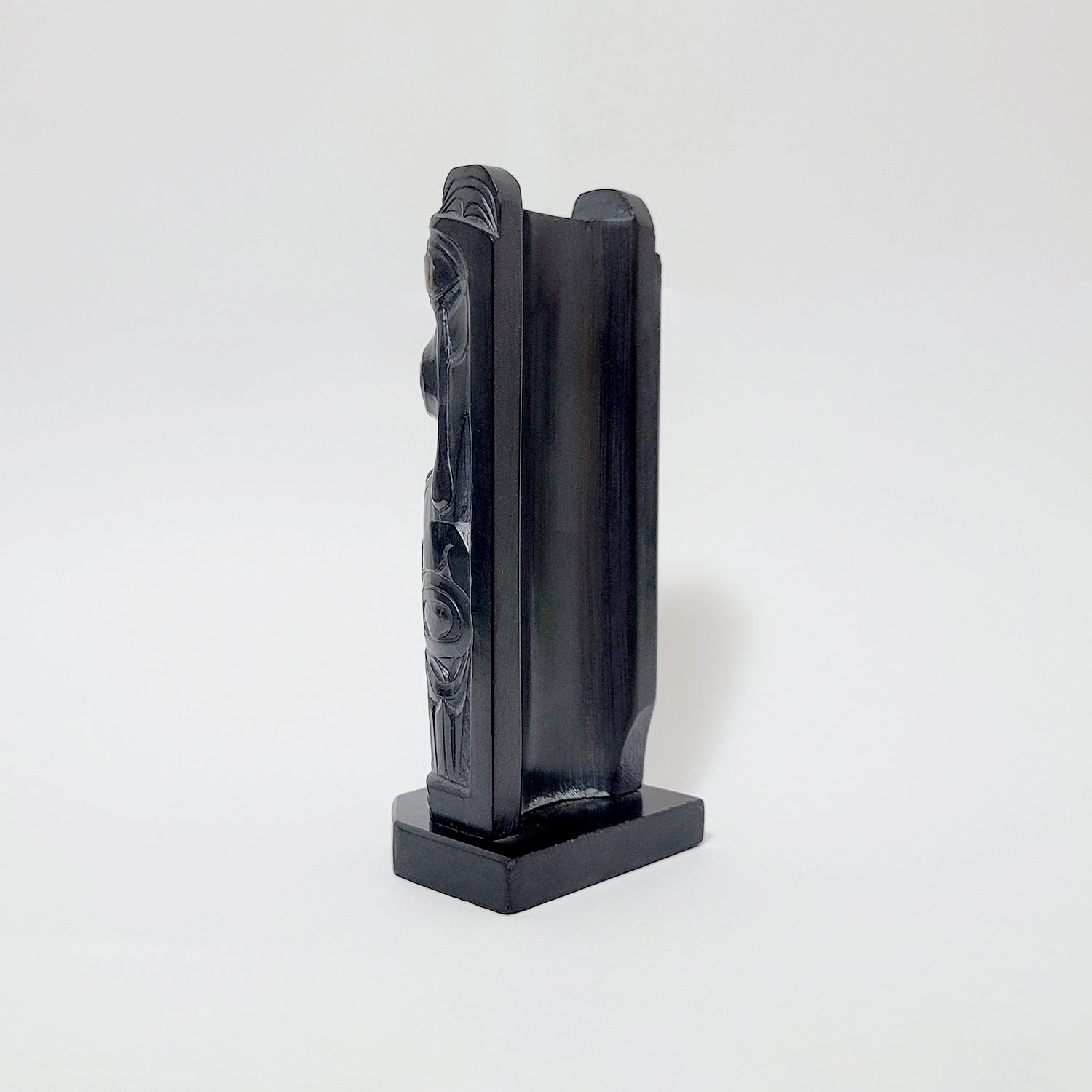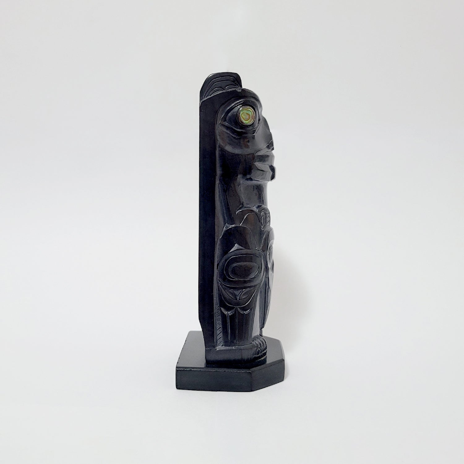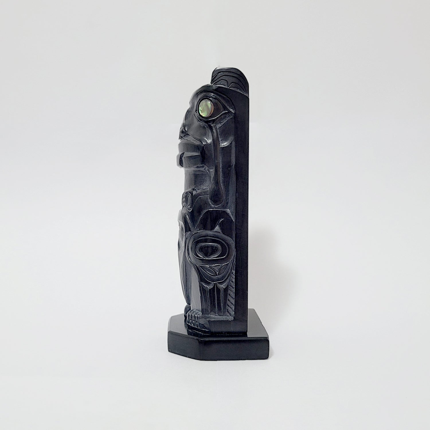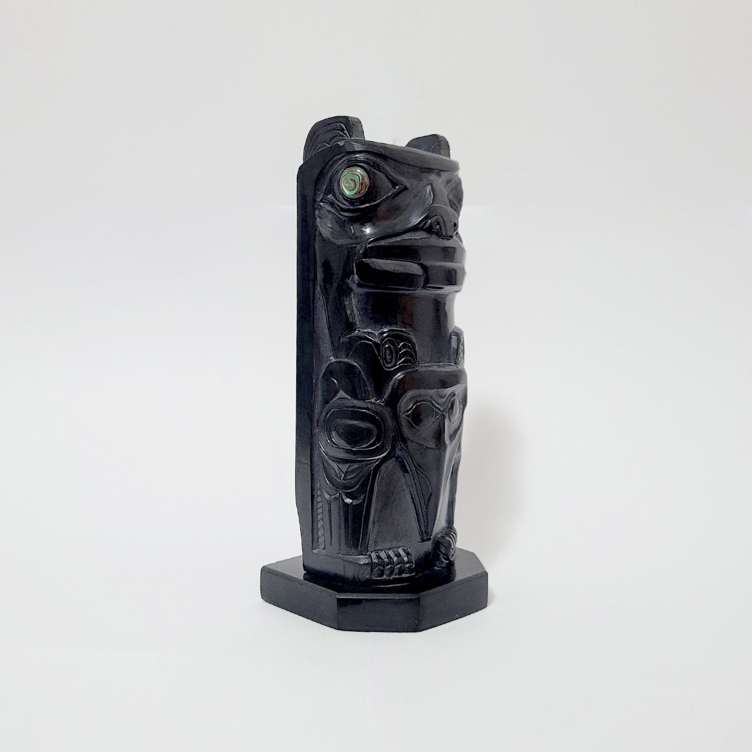 This Bear & Raven Totem Pole is hand-carved and signed by Haida artist Christopher Collison. It is carved in argillite and features two abalone inlays.