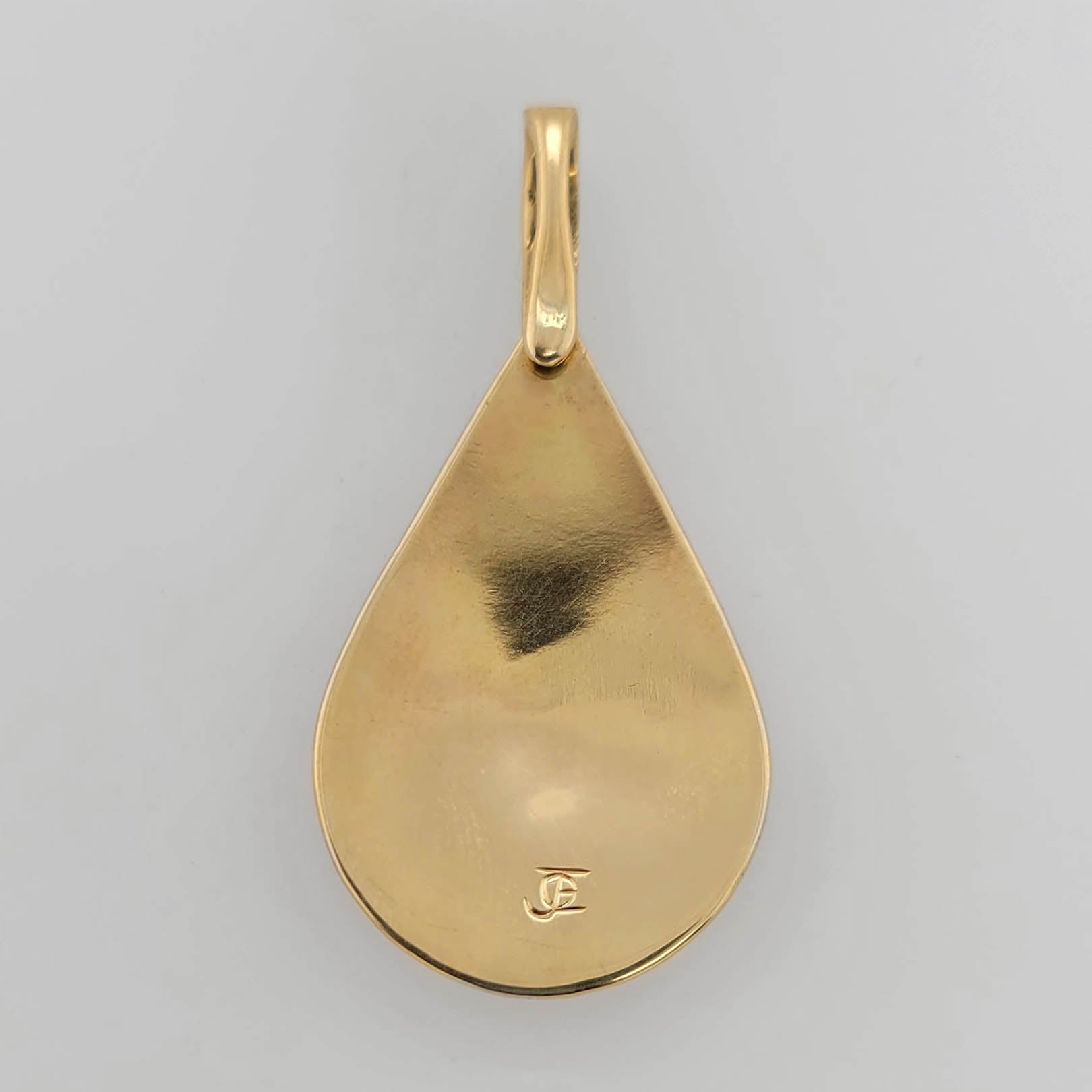 The pendant, excluding the bail, measures approximately 3/4 of an inch or nearly 2 centimeters wide and 1 1/8 of an inch or 2 3/4 centimeters high. Including the bail, the pendant weighs 0.15 ounces or 4.24 grams.